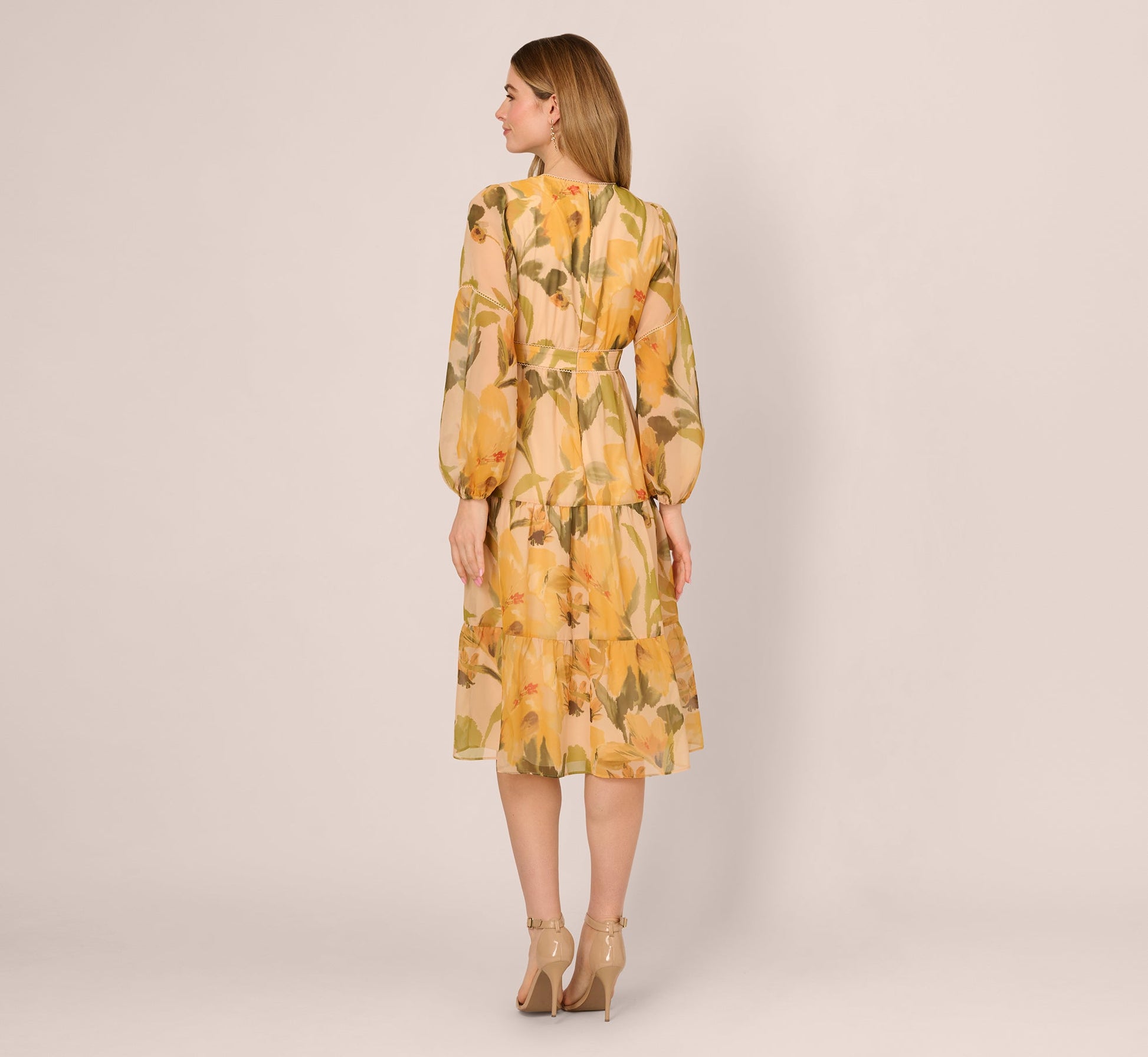 Long Sleeve Floral Organza Midi Dress In Ecru Yellow Multi