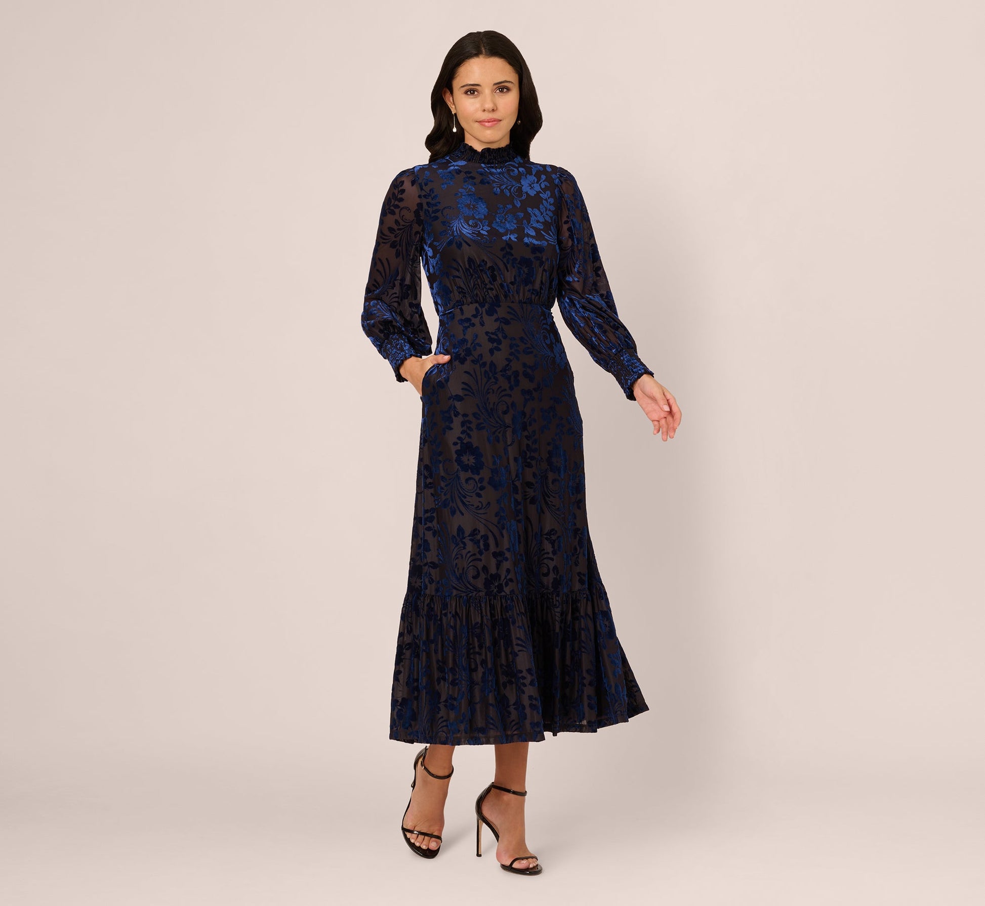 Sophisticated and polished, this gorgeous ankle length dress gets its lustrous finish from the intricate burnout velvet fabric in a soft floral pattern. Bishop sleeves, a ruffled mock neck collar, and a flounce hem add soft dimension to the A line silhouette. A back zipper and convenient side pockets complete the design. Stunning at every occasion, this dress is perfect for parties and special events when you want to look especially elegant.