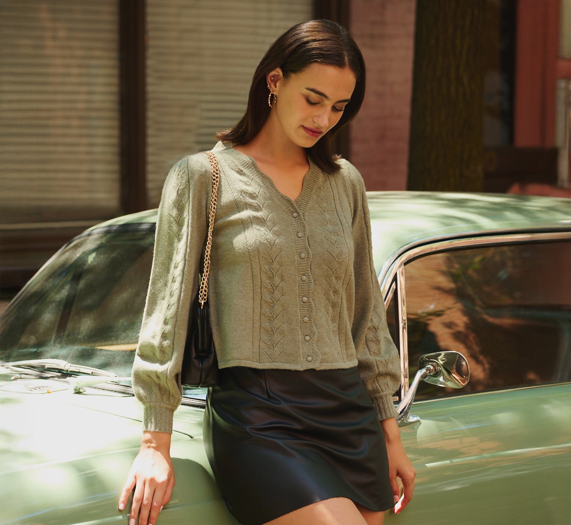 Softly detailed and effortlessly polished, this cardigan sweater is a charming finishing touch to add to your everyday ensembles. Crafted from a cozy pointelle knit, it features delicate openwork textures and long bishop sleeves that lend a romantic touch. The button front closure is outlined with scalloping along the placket that continues through the V neckline for an eye catching finish. Perfect for pairing with denim or layering over dresses, this cardigan blends comfort and ease with elegance and sophistication.