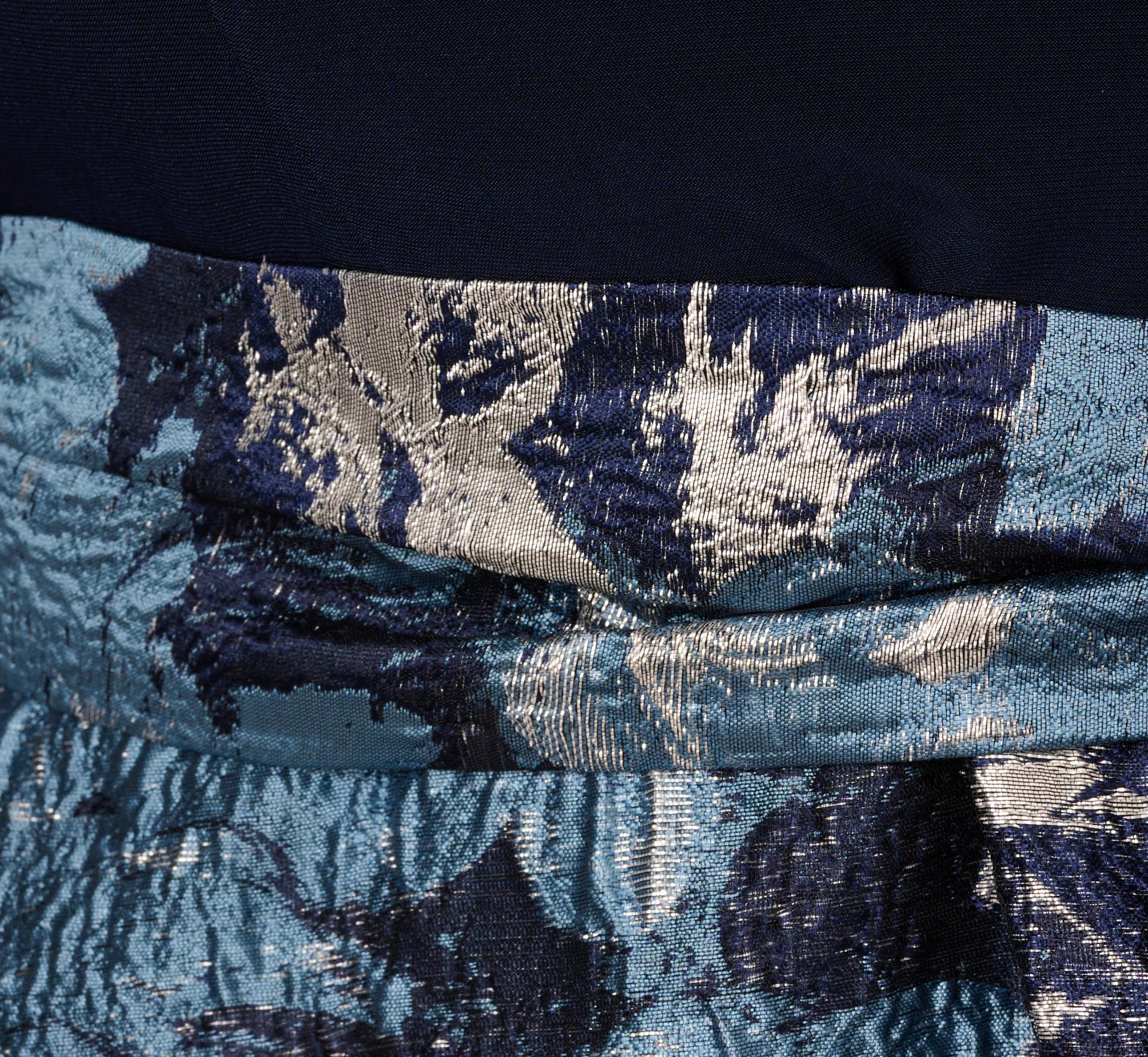 This elegant dress gives you an instantly put together look with a solid jersey bodice and a floral jacquard skirt. A shawl lapel collar in lustrous charmeuse adds a luxe tuxedo inspired touch. A tie waist detail defines the waist with a flounce skirt creating a full ballgown silhouette. A back zipper closure and side pockets complete the design. Opulent yet utterly wearable, this dress will be your new favorite for special occasions and formal affairs.