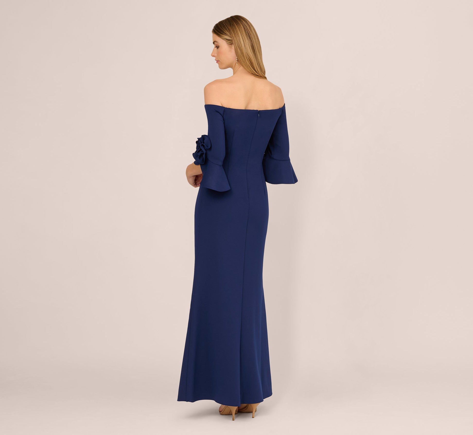 Off Shoulder Bell Sleeve Rosette Gown In Navy Sateen