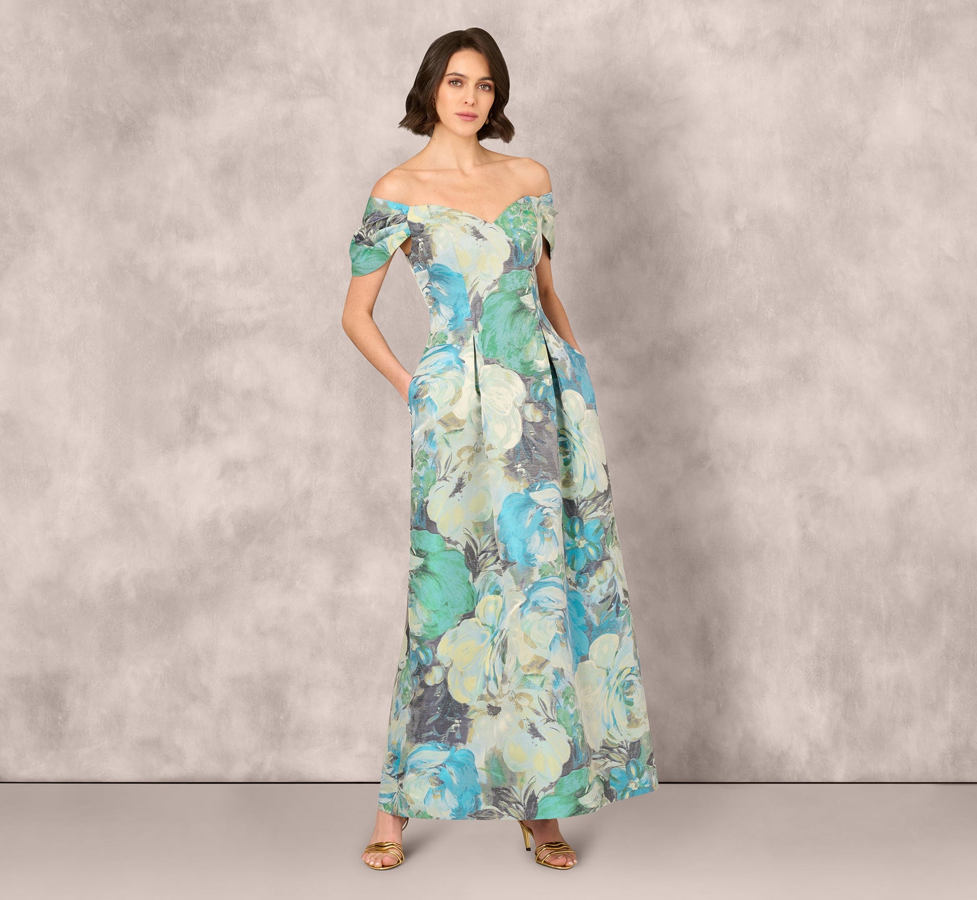 Off Shoulder Floral Jacquard Pleated Gown In Blue Multi