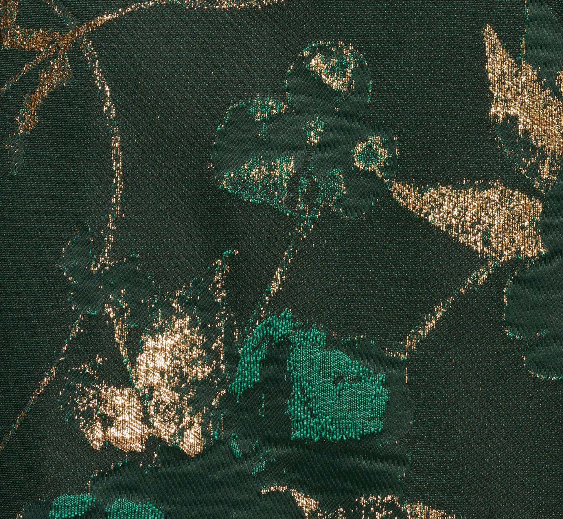 Designed to captivate, this off the shoulder midi dress is crafted from a rich jacquard fabric woven with a metallic vine motif that catches the light with every movement. The fit and flare silhouette is sculpted with princess seams through the bodice for structure, while a pleated skirt adds balanced volume. Off the shoulder styling lends a timeless elegance, perfect for formal celebrations or evening receptions. Finished with discreet side pockets for added convenience, this piece offers both beauty and function, an ideal choice for weddings, holiday gatherings, or any occasion that calls for something truly special.