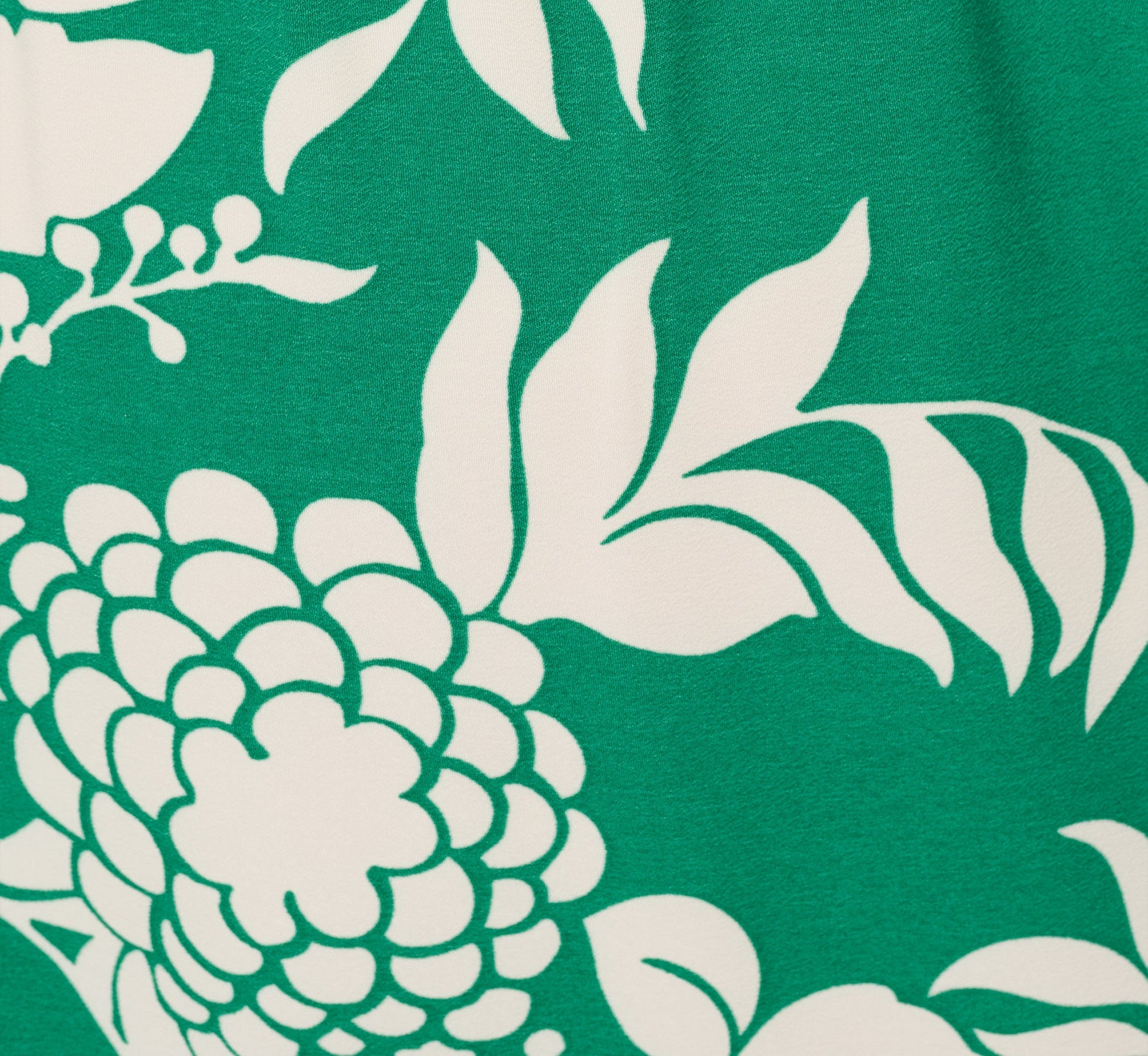 Sunny and breezy, this tea-length dress is a dynamic one shoulder design in a green and white botanical print. Princess seams and a side zipper ensure a fitted bodice. A gathered skirt with a ruffle hem creates a soft A-line silhouette. Perfect for daytime and outdoor events, this lovely floral dress will be your new warm weather favorite.