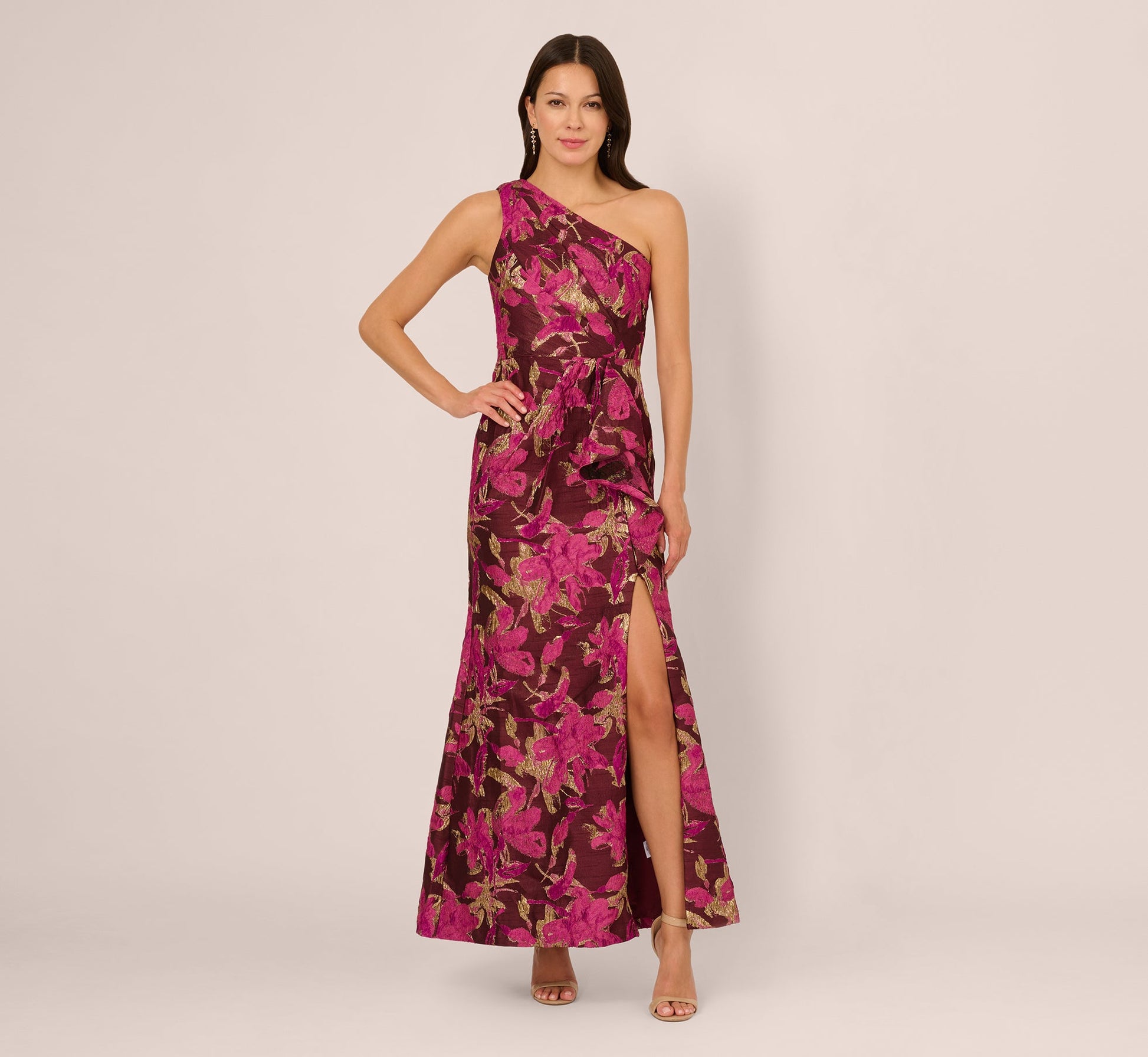 Clever little details elevate this one shoulder full length dress for an absolutely elegant effect. Crafted in rich floral jacquard fabric woven with metallic thread, this mermaid silhouette gown has a subtle shimmer. A back zipper closure ensures a fitted look. Tailored pleating at thebodice and draping at the waist create dynamic texture with a side slit adding movement to the maxi length skirt.