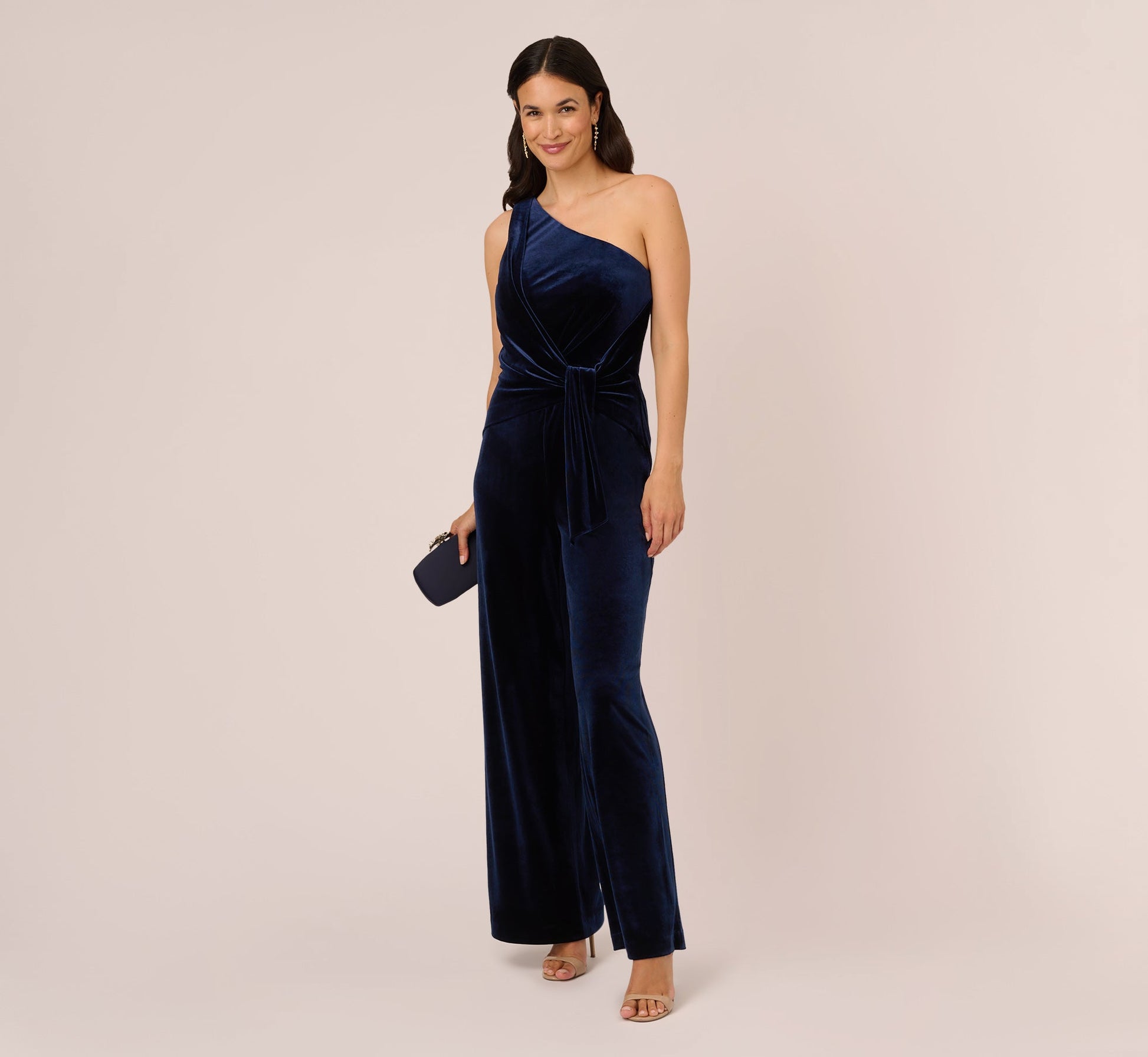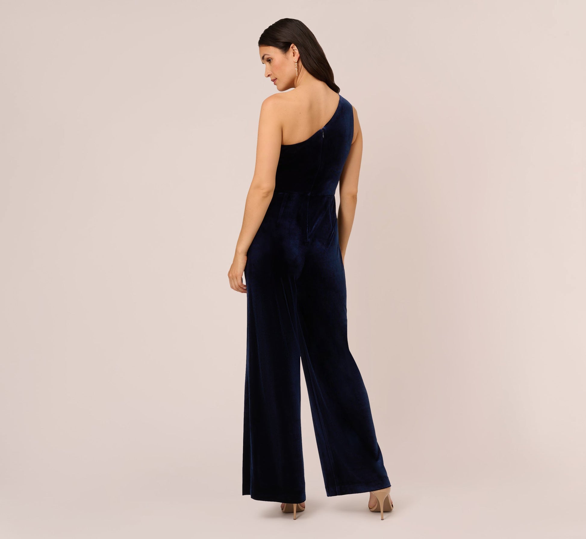 One Shoulder Velvet Jumpsuit With Draped Accent In Midnight