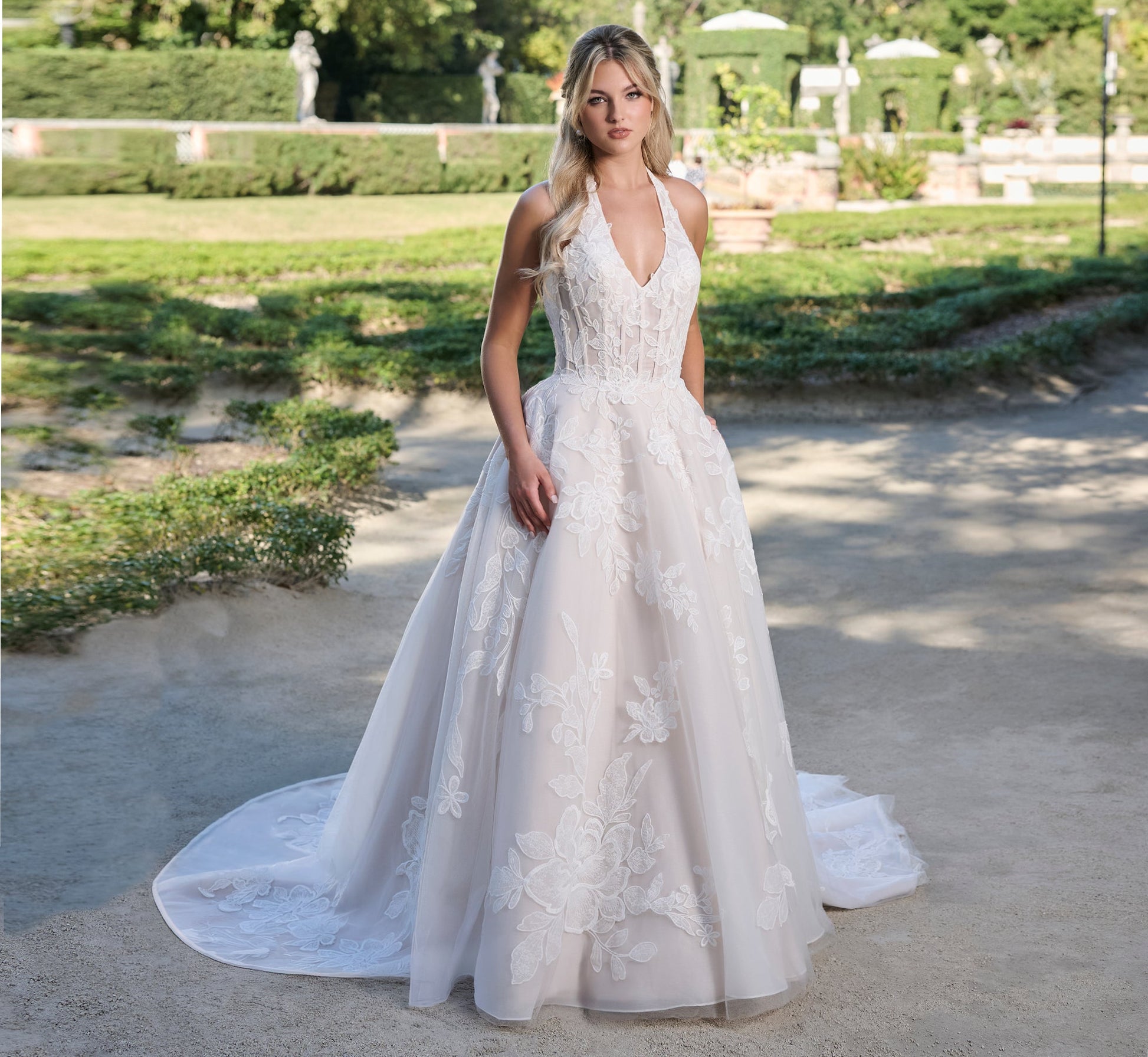 Deep V-neck halter ballgown with lace pieced floral appliques.