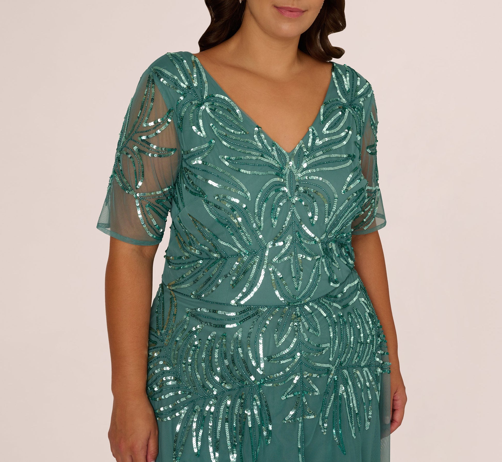 Plus Size Beaded Mesh Long Dress In Green Slate