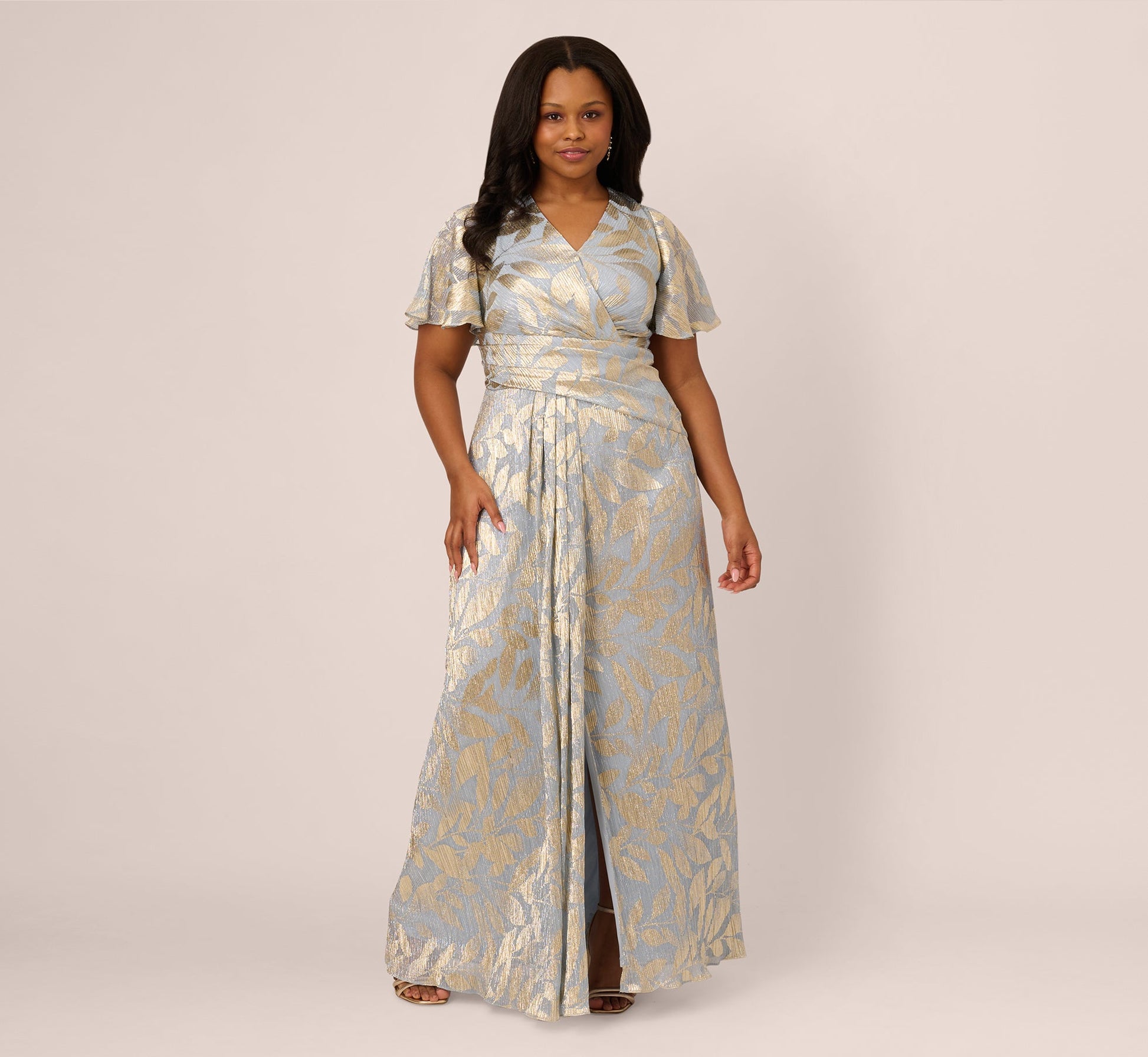 Plus Size Foil Leaf Short Sleeve Gown With Draped Details In Light Blue Gold