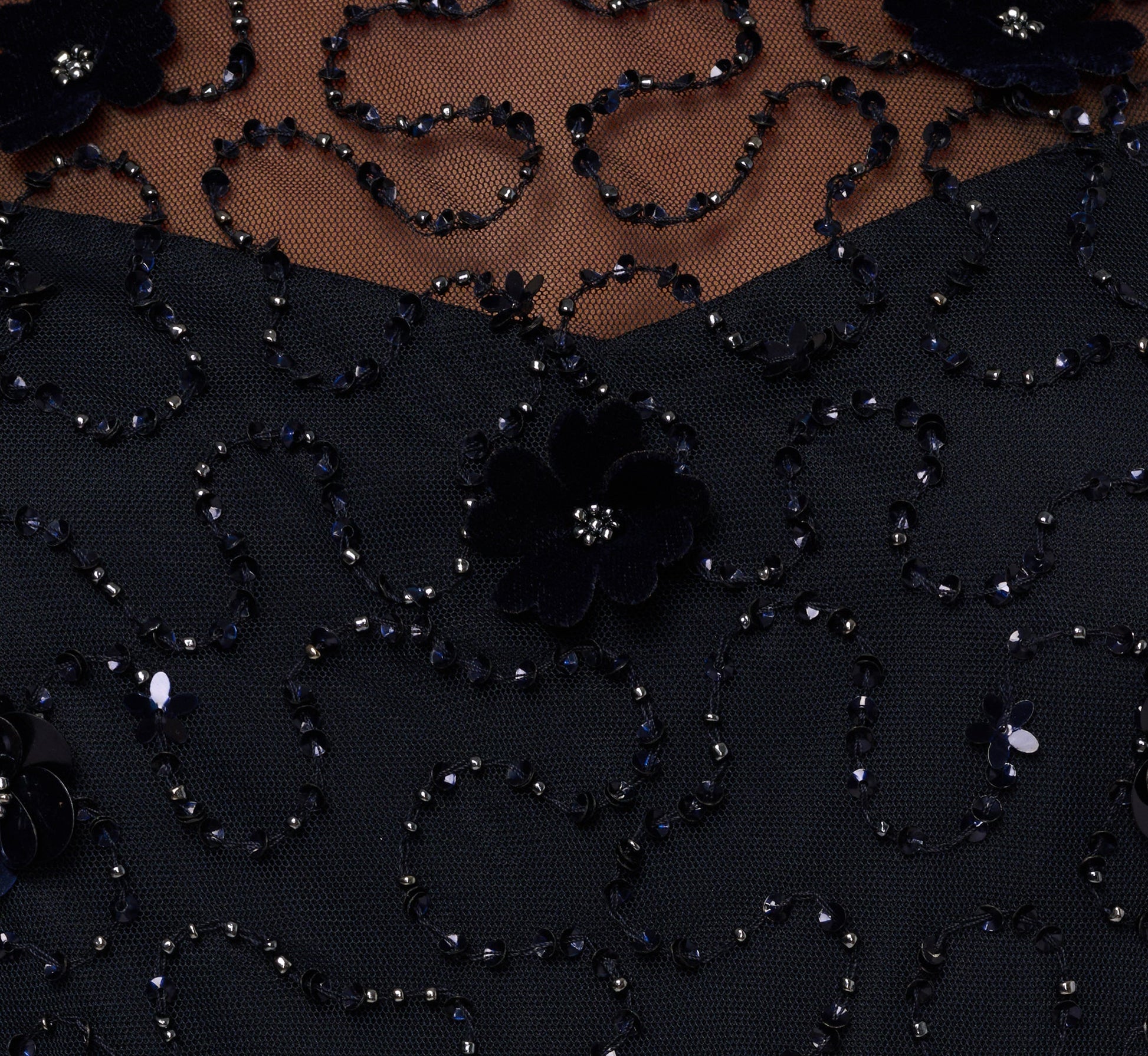 Classically elegant with an extra touch of sparkle, this fit and flare midi dress cuts a striking figure. The mesh overlay creates an illusion sweetheart neckline with long sheer sleeves. The allover beaded embellishment is accented with 3D flower details in paillette sequins and velvet for texture and dimension. Perfect for your next special occasion or big event, this long sleeve cocktail dress will turn heads anywhere you wear it.