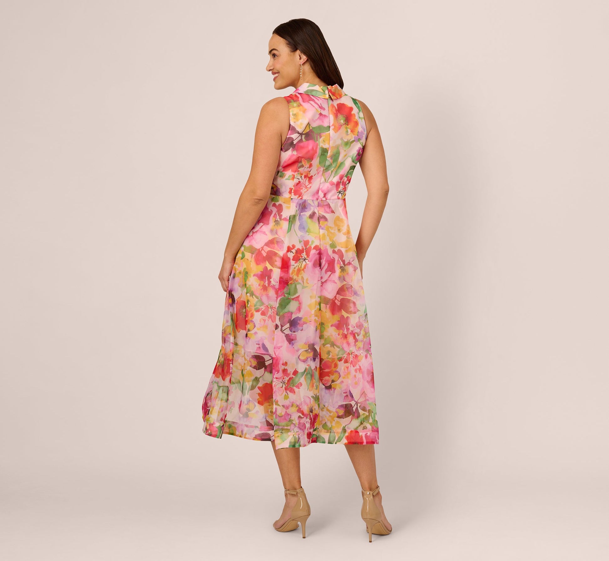Pretty and polished, this colorful fit-and-flare dress is constructed in floral organza fabric for a soft but structured look. The draped high low skirt creates dramatic dimension and the collared surplice neckline gives you a face-framing moment. A back zipper closure ensures the perfect fit. Designed for celebrations and special moments, this floral midi dress is ready for every party.