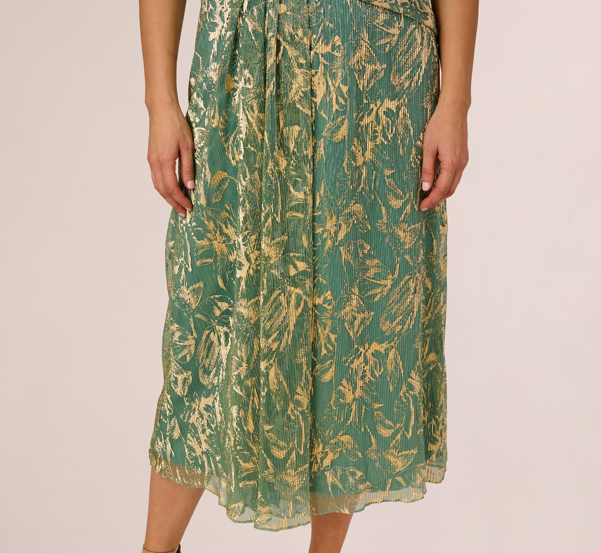 This pretty green dress is constructed with a magical crinkle fabric with a metallic finish and a foil botanical print on top. A surplice neckline, draped waist details, and a soft A-line skirt create dimension and movement to complement the shimmering material. A back zipper closure ensures the perfect fit. You'll love having this dress in your closet to wear for celebrations big and small.