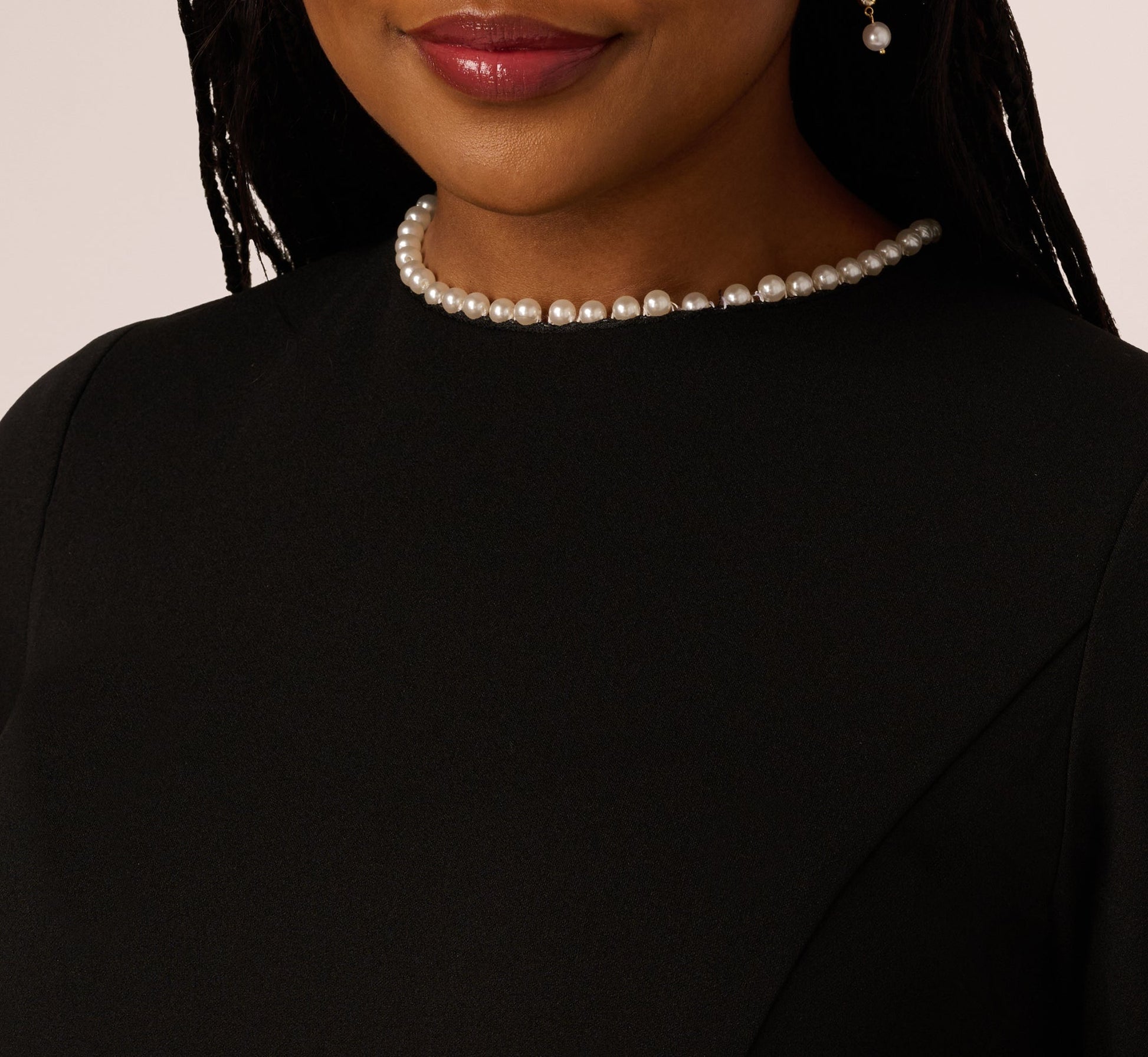Plus Size Three Quarter Bell Sleeve Pearly Trim Sheath Dress In Black Ivory