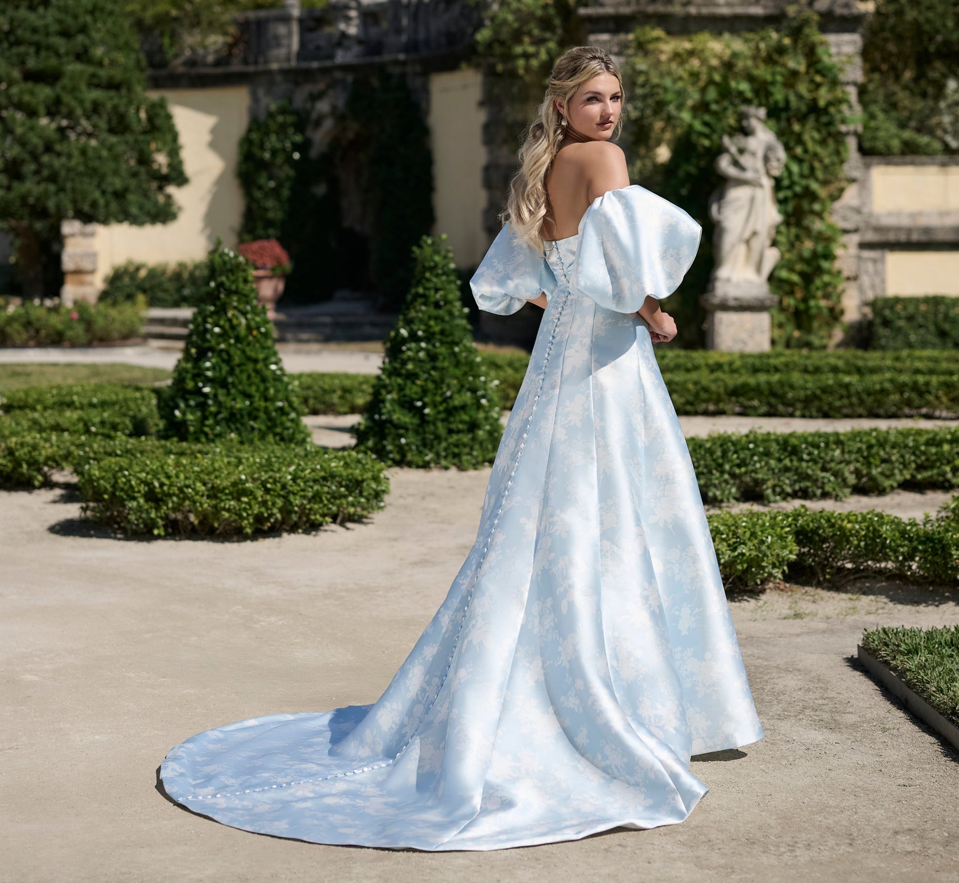 Pointed neckline, modified A-line gown with double princess seam detail and detachable sleeve.
