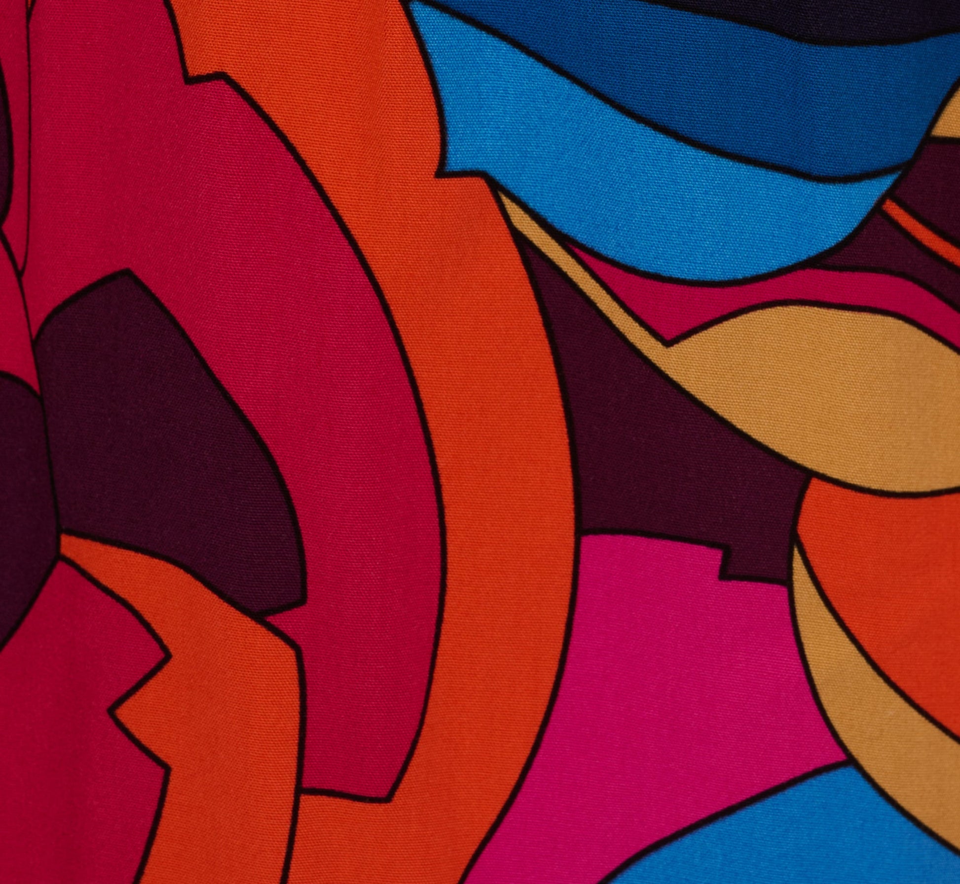 Clever construction details give this short printed dress its sweet and feminine look, from the flounce skirt to the long bishop sleeves to the two matching bows at the shirred waist. The colorful floral print features a 70's-inspired design, complemented by the unique wavy seam that attaches the gathered flounce to the skirt. Brighten up your everyday look with this fun update on the classic long sleeve V-neck dress.