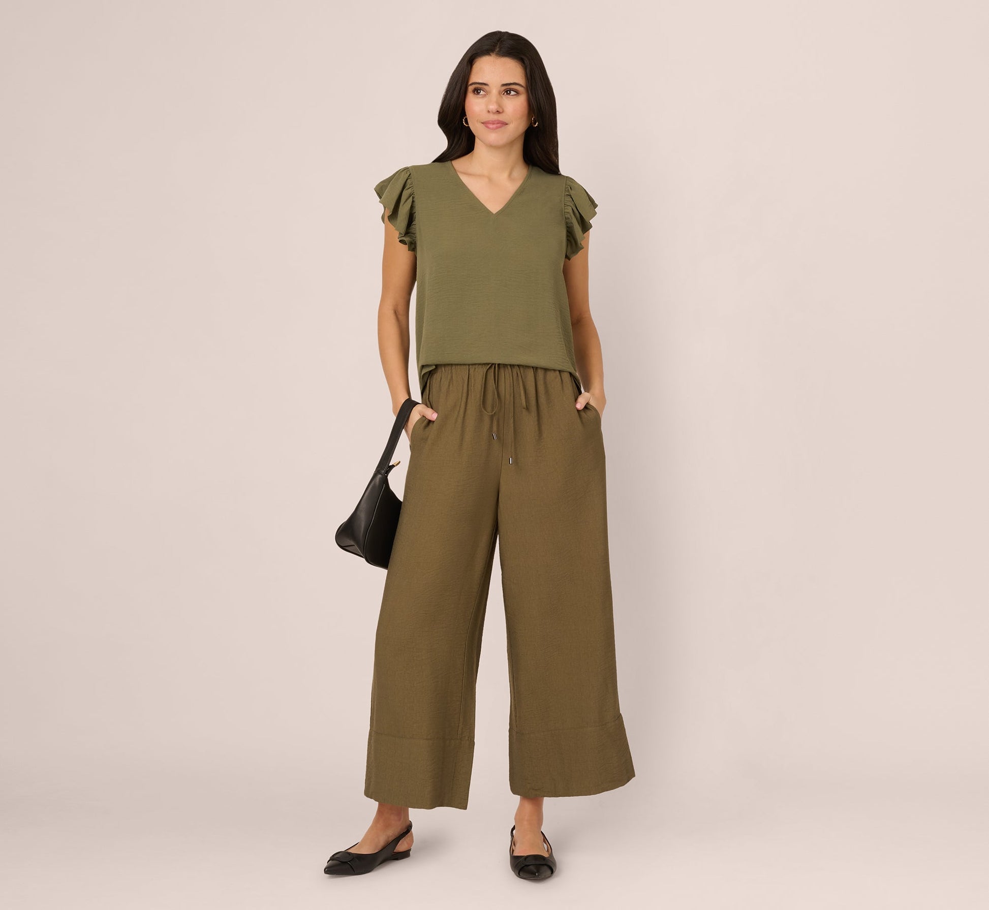Ruffle Sleeve V Neck Satin Top In Olivine