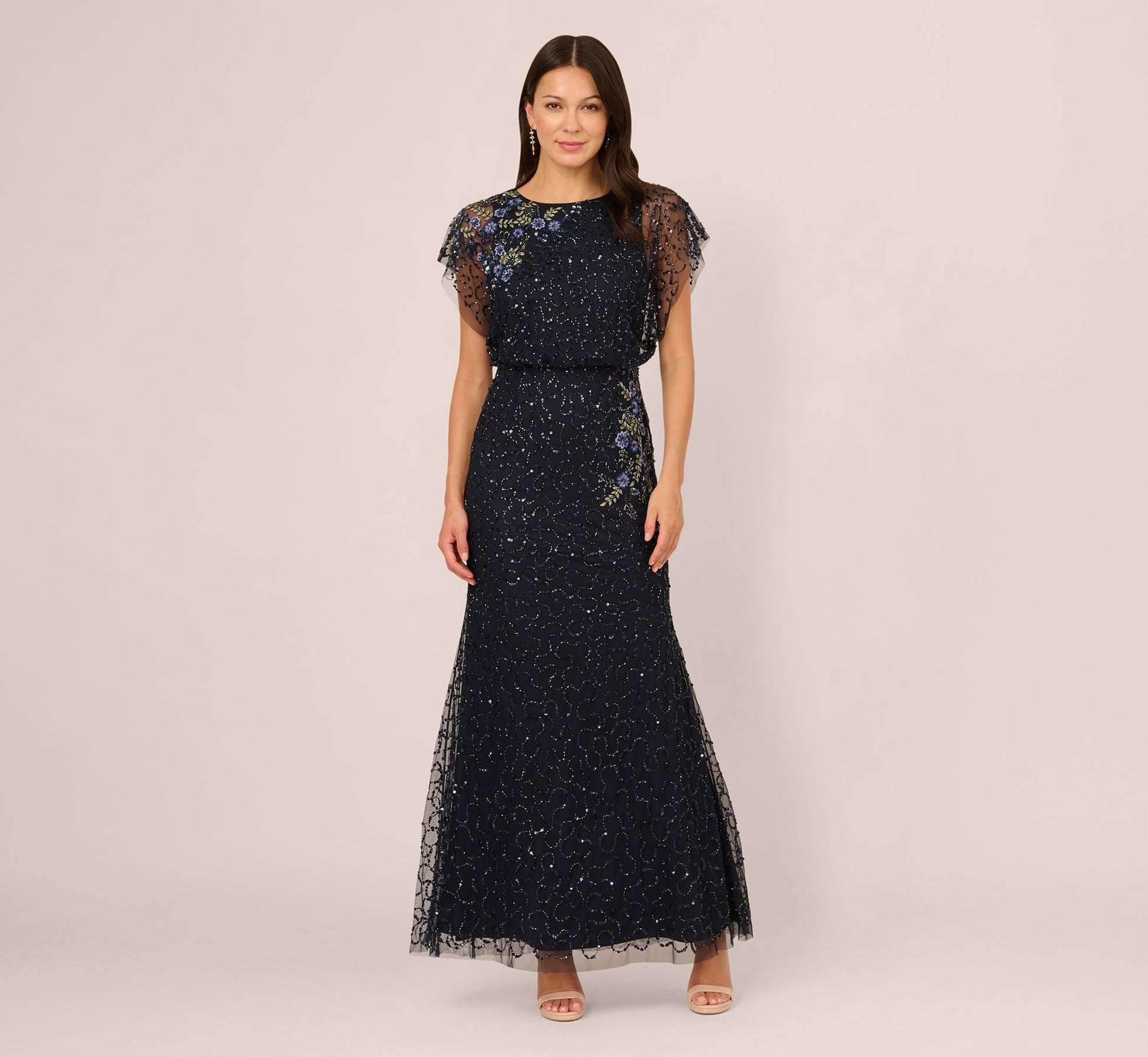 This evening gown pairs intricate embellishment with graceful structure for a look that feels both timeless and artful. Crafted from sheer mesh and adorned with tonal beading and sequins throughout, it shimmers subtly under the light. The mermaid silhouette is softened by a blouson waist and sheer dolman sleeves that drape gently over the shoulders. A classic boat neckline offers an elegant frame, while colorful floral embroidery at one shoulder and along the hip adds a delicate burst of contrast. Perfect for formal weddings, galas, or black tie events, this is the dress design is where detail and drama meet.