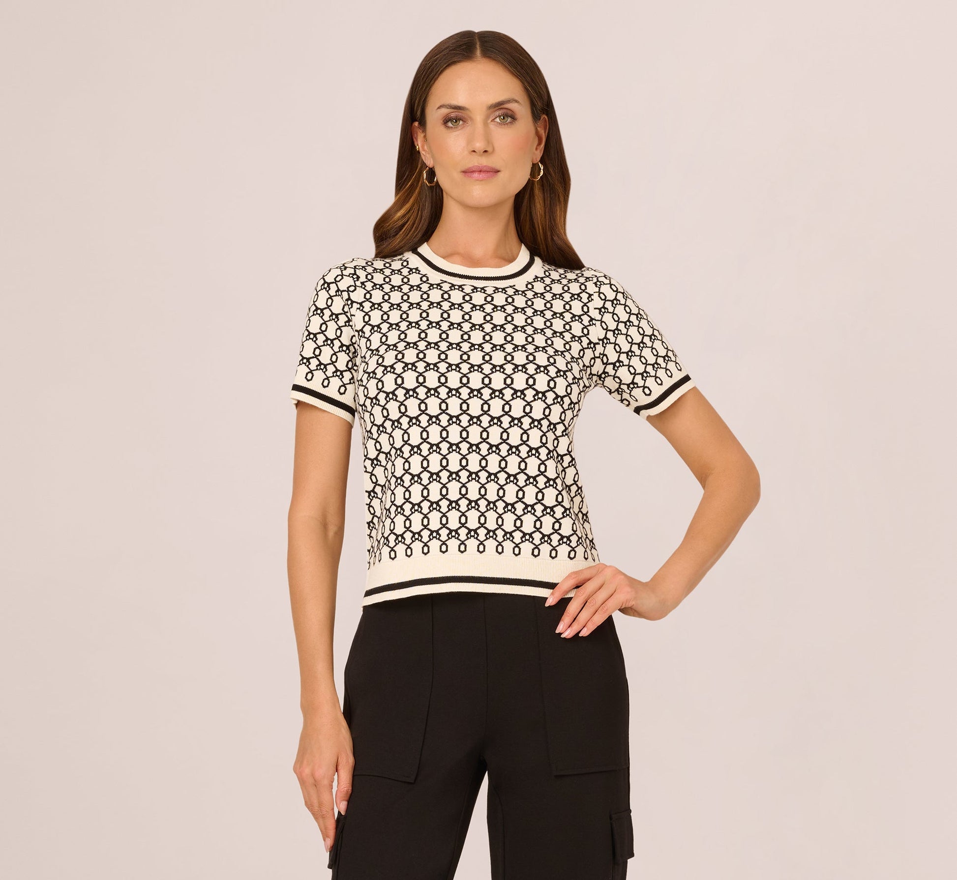 Short Sleeve Chain Patterned Knit Top In Cream Black Double Chain Link