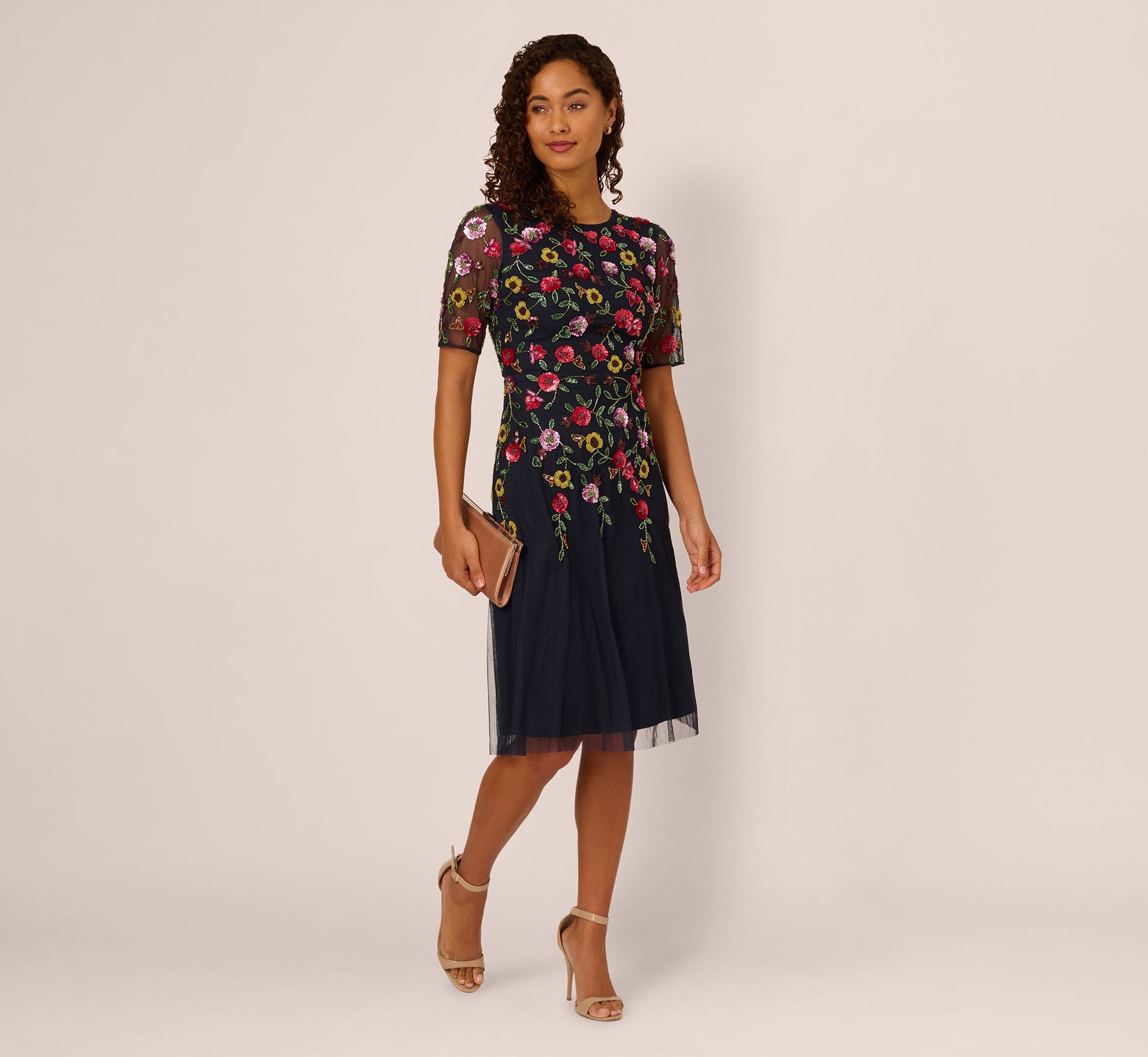 Short Sleeve Floral Beaded Midi Dress In Navy Multi