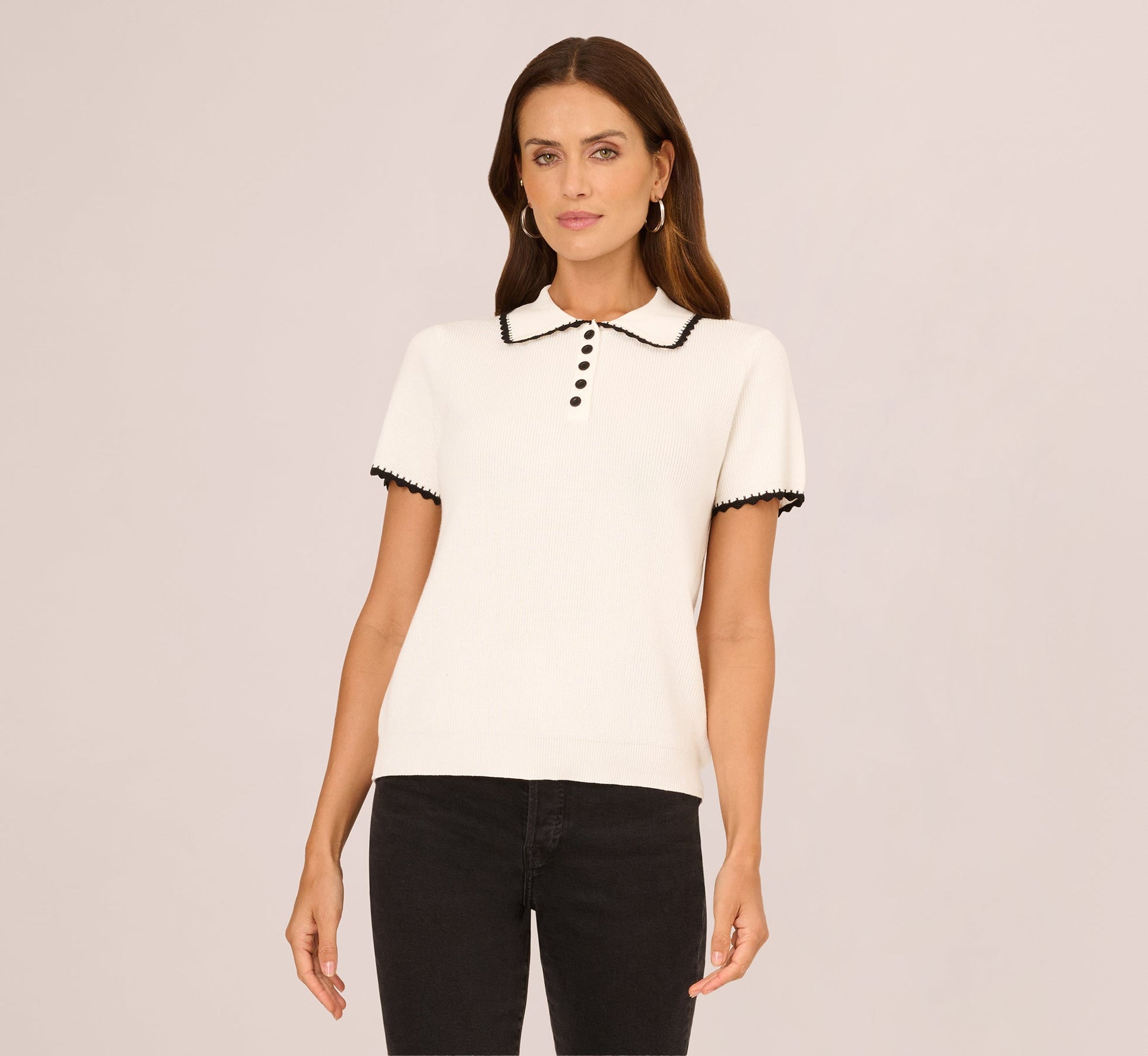 Short Sleeve Scalloped Trim Polo Sweater In Cream Black