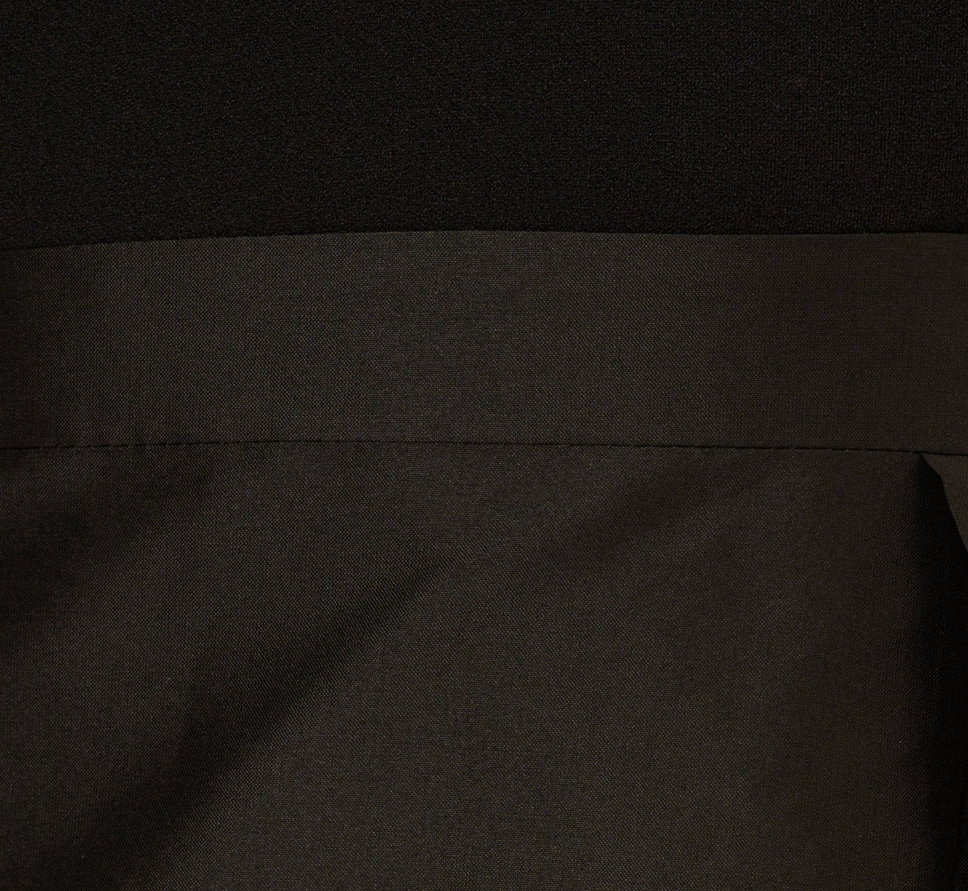 Sleek and sculptural, this evening gown blends tailored structure with fluid design. The fitted bodice is cut from smooth crepe with narrow shoulders, princess seams, and subtle bust darts that create clean lines and refined shape. From the waist, a lustrous taffeta skirt unfolds in soft pleats, falling into an asymmetrical hemline that adds dynamic movement. Ideal for formal evenings, cocktail galas, or black-tie events, this contemporary evening dress style is where impact meets intention.