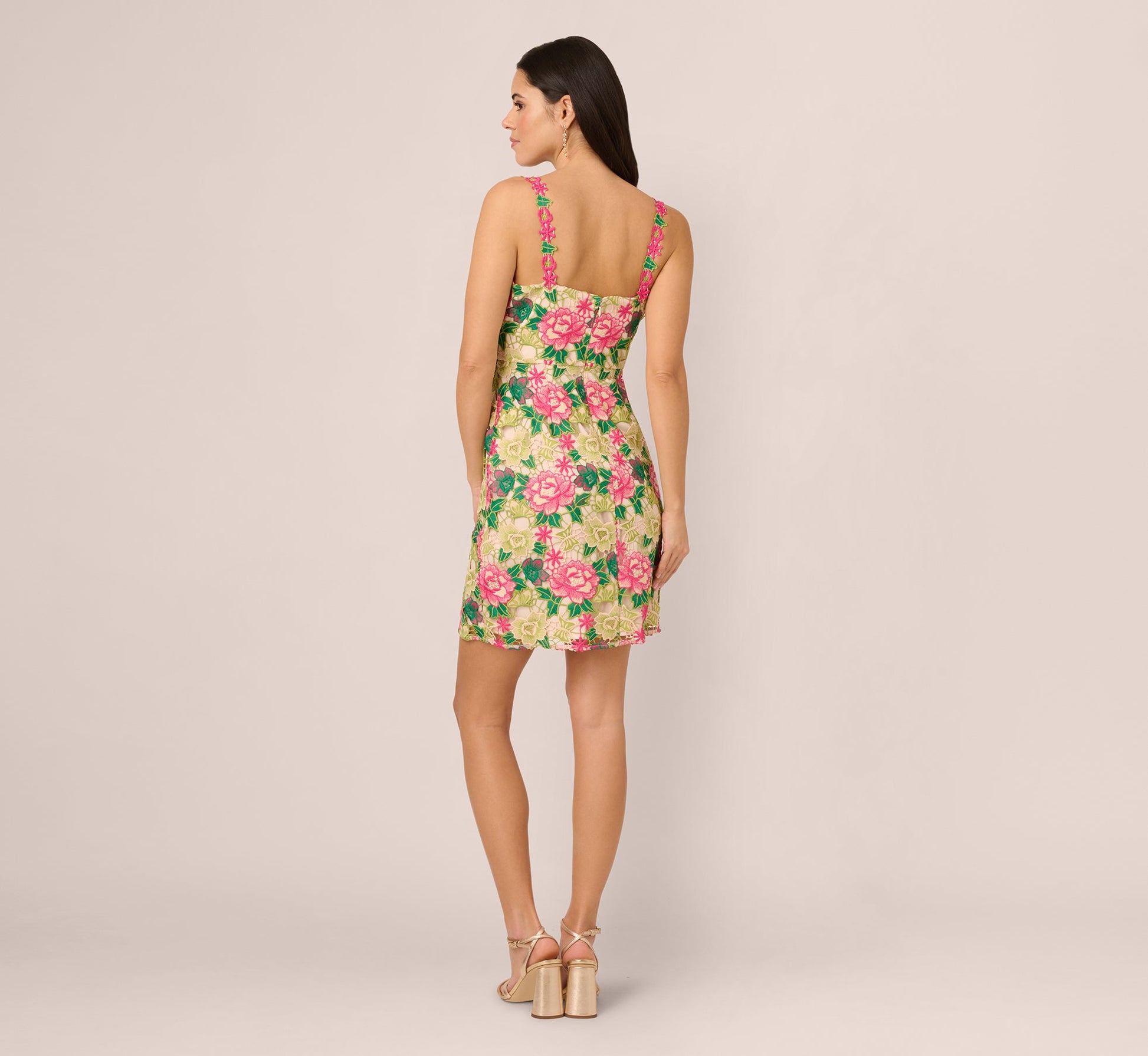 Colorful and sunny, this smart sleeveless sheath dress features allover floral embroidery that adds texture and depth to the design. The straps are constructed with matching multicolor floral lace for a delicate face-framing effect. A back zipper closure ensures a perfect fit. You'll love this cute little dress for garden parties, picnics, or any other warm weather gathering.