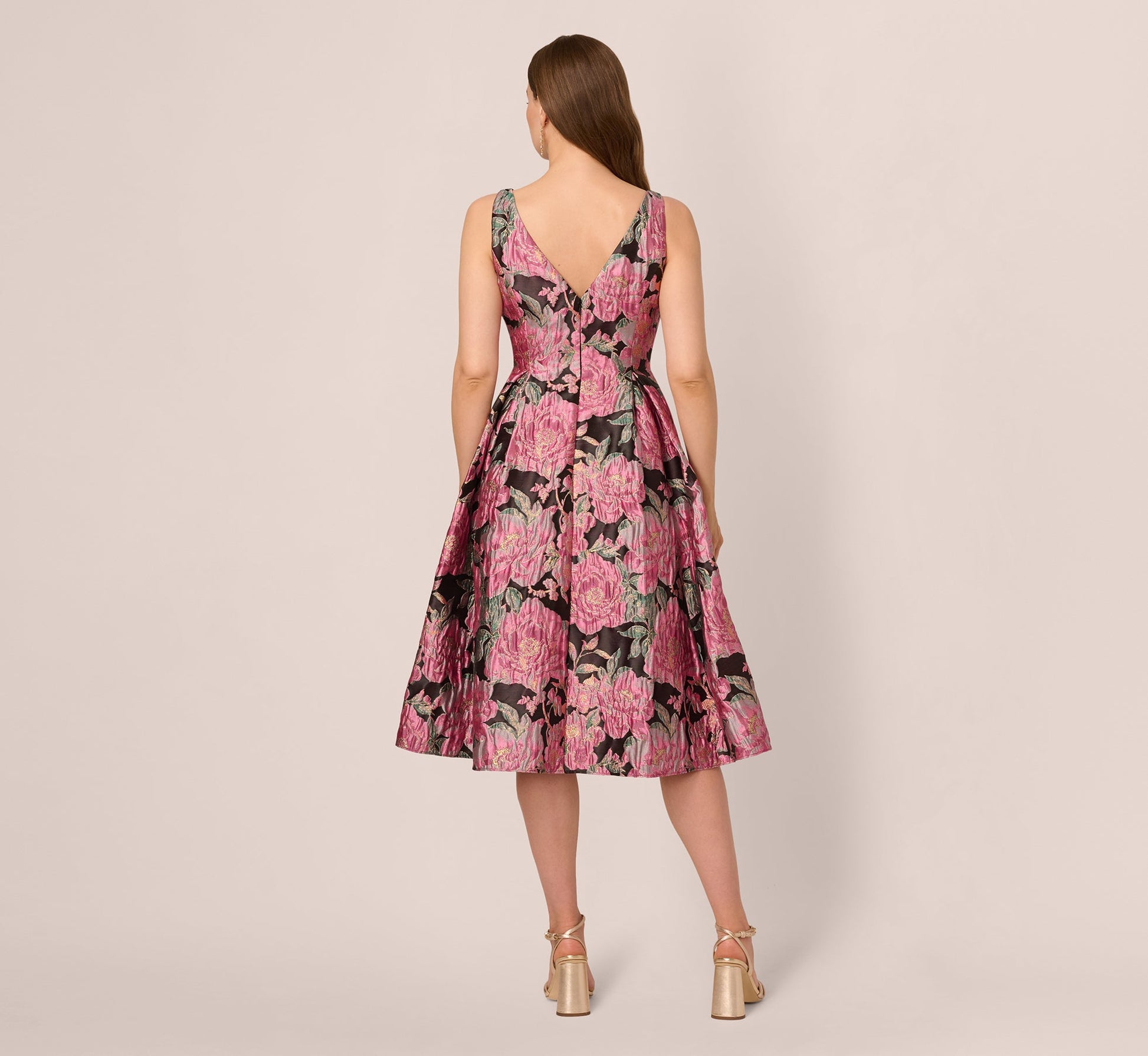 Metallic floral jacquard fabric gives this midi cocktail dress its soft texture and luminous sheen. Princess seams down the bodice meet with skirt pleats at the waist for a sculpted fit and flare silhouette. The boat neckline and midi hemline complete the silhouette with side pockets adding a convenient finishing touch. Classic styling and elevated details combine to make this dress an elegant choice for special occasions and dressy events.