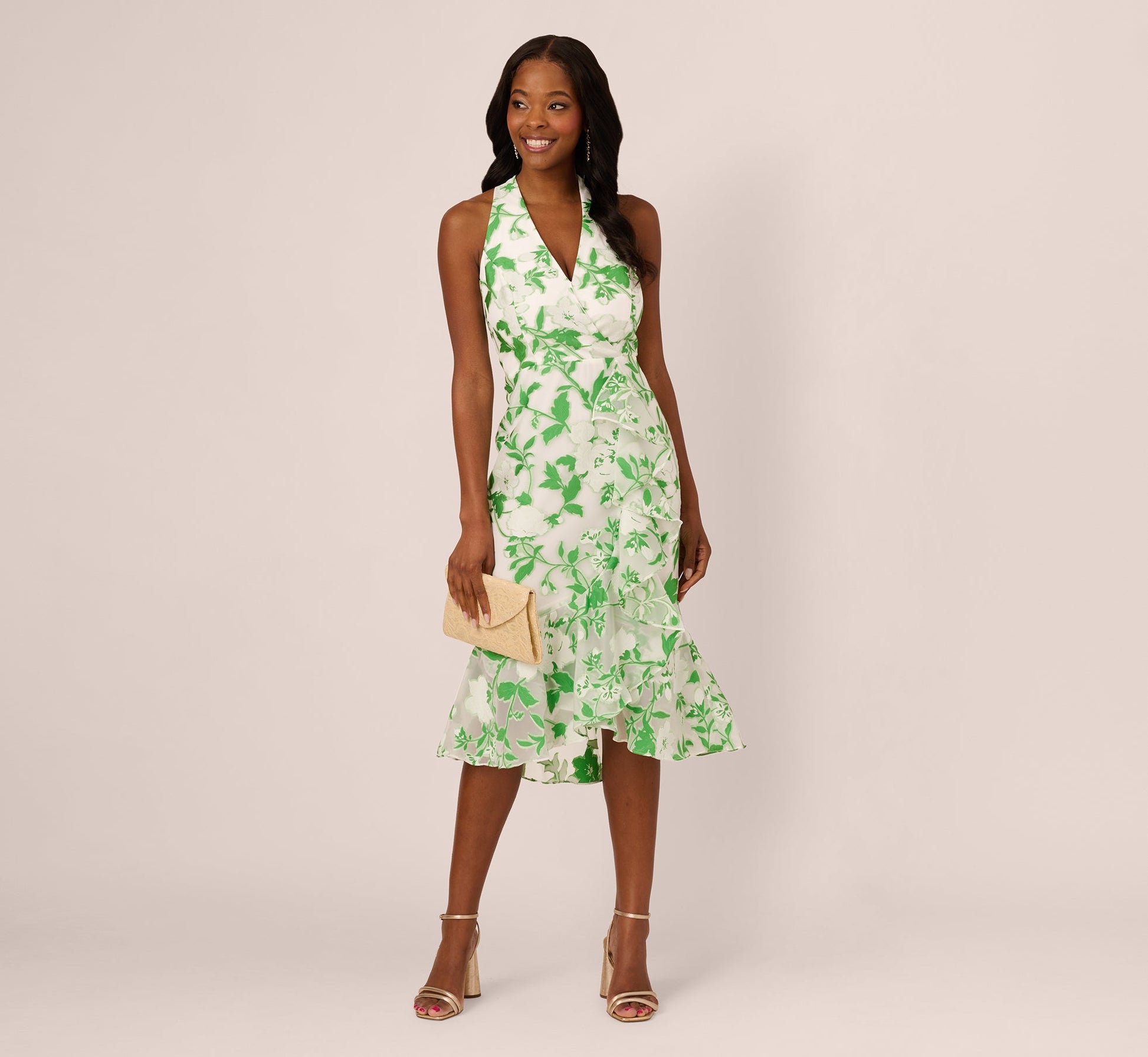 Crafted from airy organza jacquard fabric woven with a delicate botanical pattern, this midi dress brings sophisticated elegance to any occasion. The fitted mermaid cut defines your silhouette with a surplice neckline and ruffle hem completing the effect. A cascading ruffle accent flows down the front of the skirt, adding movement and dimension. Finished with a back zipper closure for a seamless fit, this dress is a stunning choice for garden parties, weddings, and special celebrations.