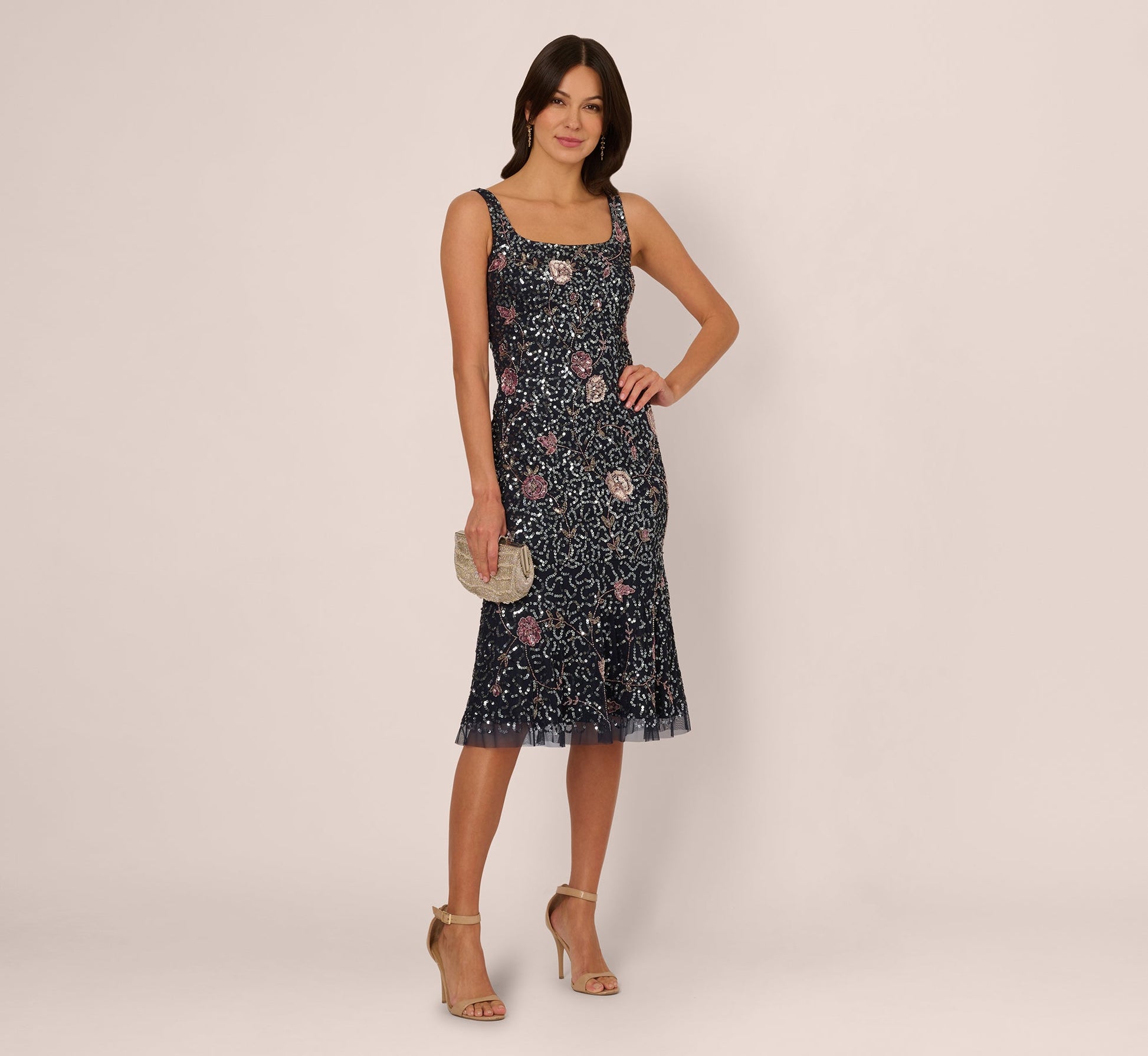 Allover sequin embellishment with beaded floral details gives this navy blue midi dress its sparkling finish. The wide scoop neck and back frame your face and the soft A-line cut creates an elegant silhouette. A back zipper closure ensures the perfect fit. Get glammed up in this pretty little cocktail for your next night out or big event.