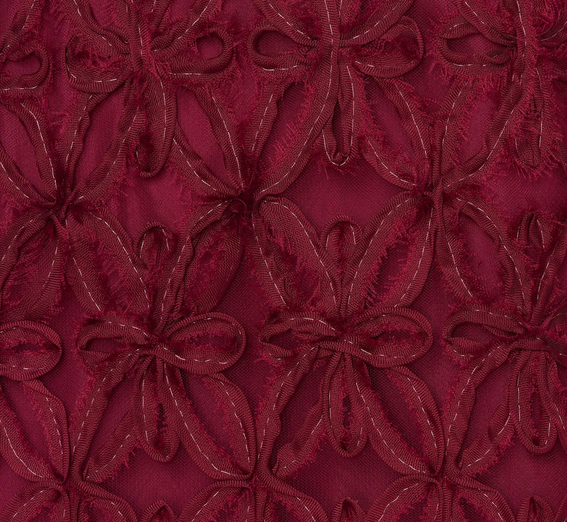 Intricate texture and timeless elegance define the look of this sleeveless midi dress, featuring an overlay of raw edge soutache embroidery for a rich, dimensional look. The V neckline is accented with sheer details for a delicate face framing effect. Designed with an above the ankle hemline, the flowing A line silhouette moves beautifully with every step. A back zipper closure ensures a seamless fit, making this gorgeous dress a stunning choice for parties and special occasions.