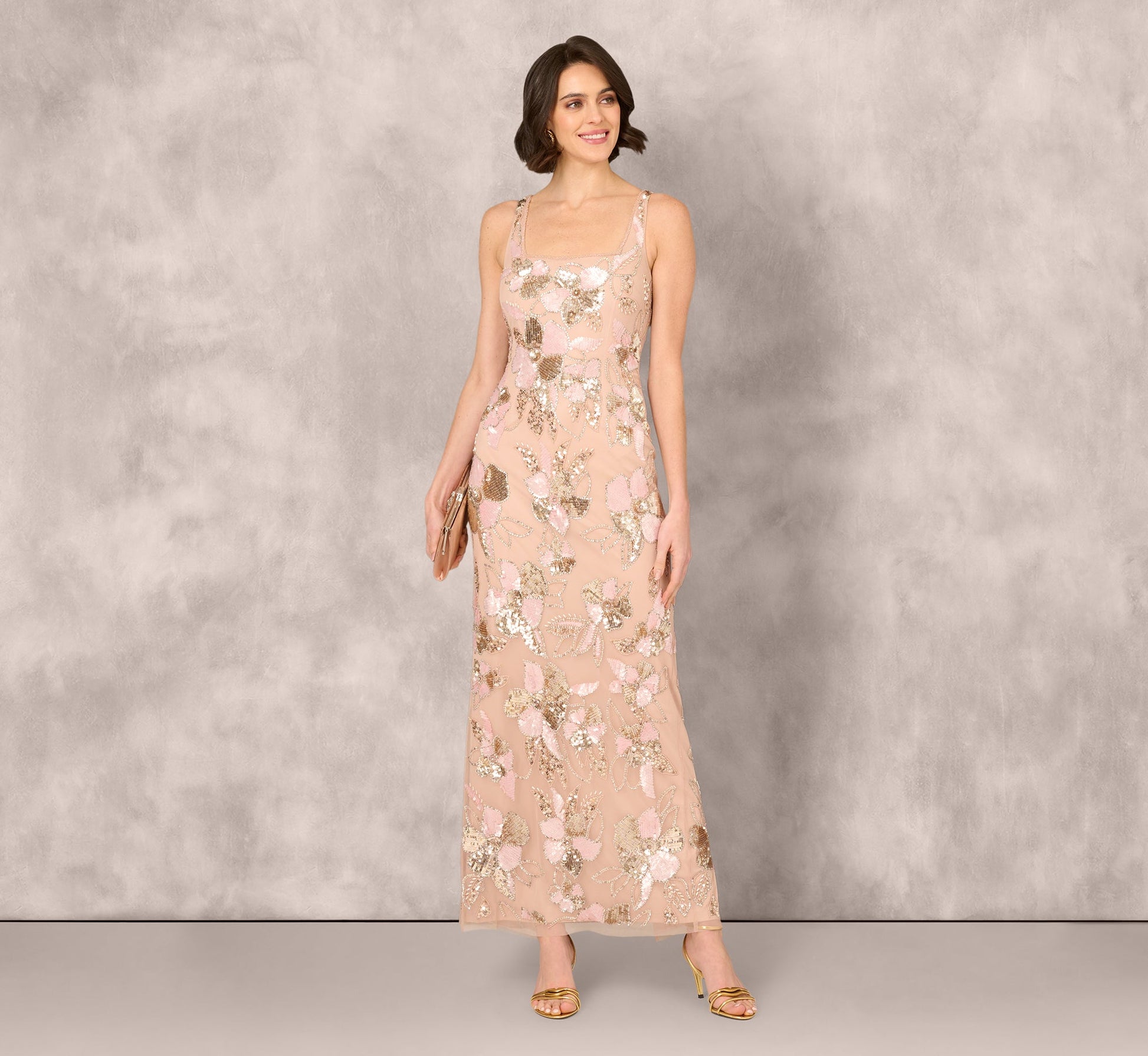 Sparkling beads and sequins highlight the intricate allover floral design on this lovely blush pink gown. The square neckline and square back are trimmed in matching beading for a pretty face-framing effect. Careful tailoring and a back zipper ensure a graceful column silhouette. Next time you want to turn heads at a big event, this is the evening dress for you.