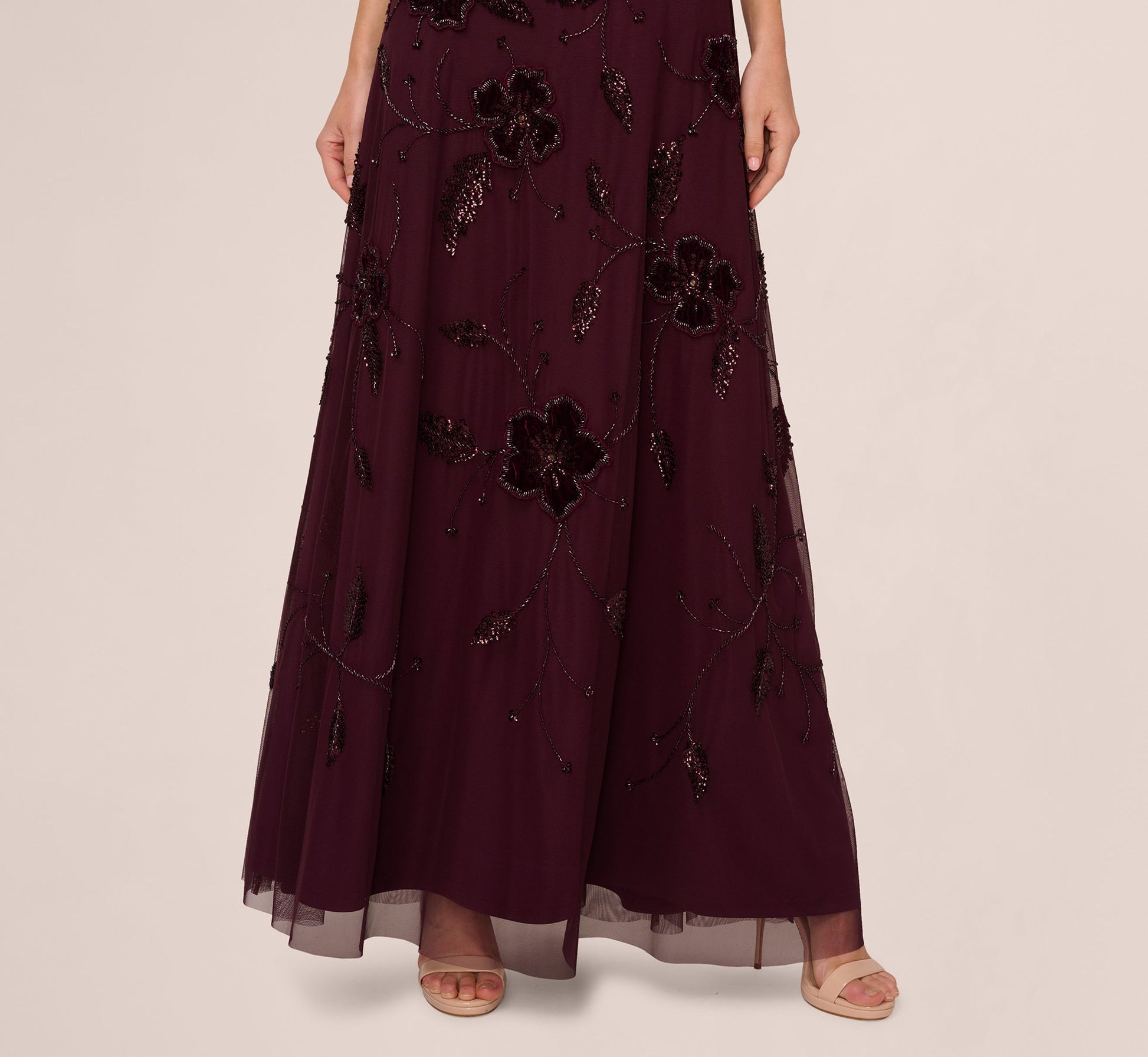 Turn heads at any formal affair in this stunning maxi gown, featuring a mesh overlay adorned with hand applied velvet flowers and sparkling beadwork that catches the light from every angle. The sweeping A line skirt flows effortlessly from the waist, creating a romantic, ethereal silhouette. A deep V neckline and matching V back add graceful definition, while sheer straps offer an elegant finish. Perfect for black tie events, galas, or evening weddings, this gown brings artistry and glamor together in one unforgettable look.