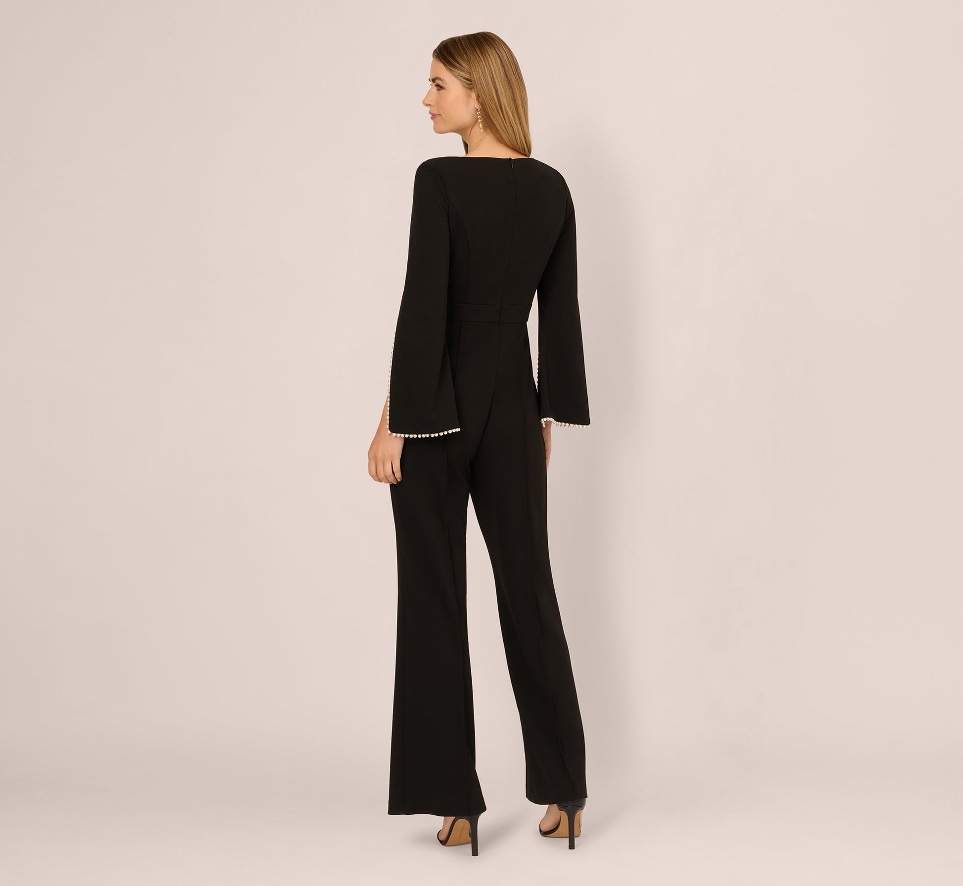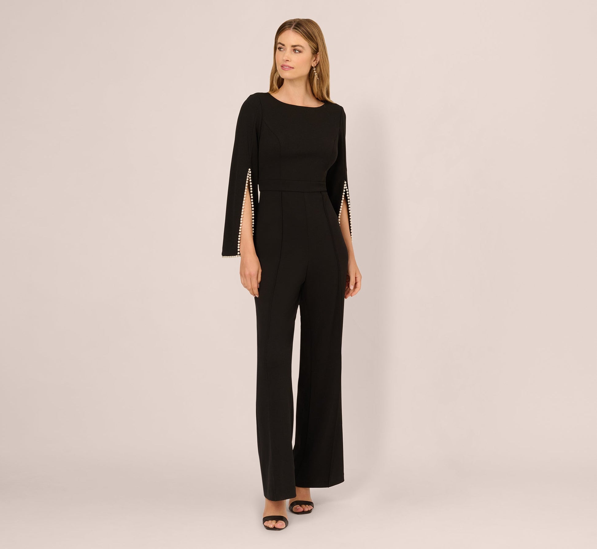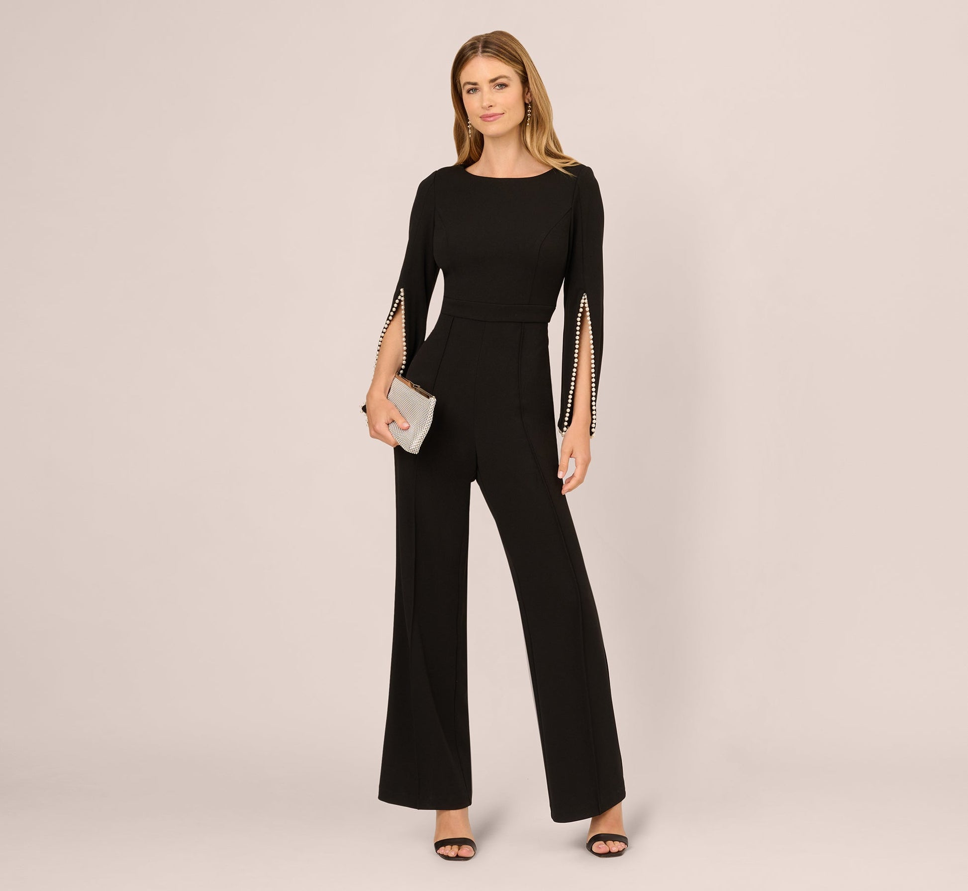 Tailored with clean lines and a touch of embellishment, this knit crepe jumpsuit brings understated drama to evening looks. The wide leg silhouette offers a fluid, elongating shape, balanced by a structured bodice and a graceful boat neckline. The long sleeves are split to reveal a trail of faux pearls, adding a subtle shimmer and a hint of movement with every gesture. Perfect for cocktail receptions, formal dinners, or evenings that call for something beyond the expected, this one piece delivers polish with personality.