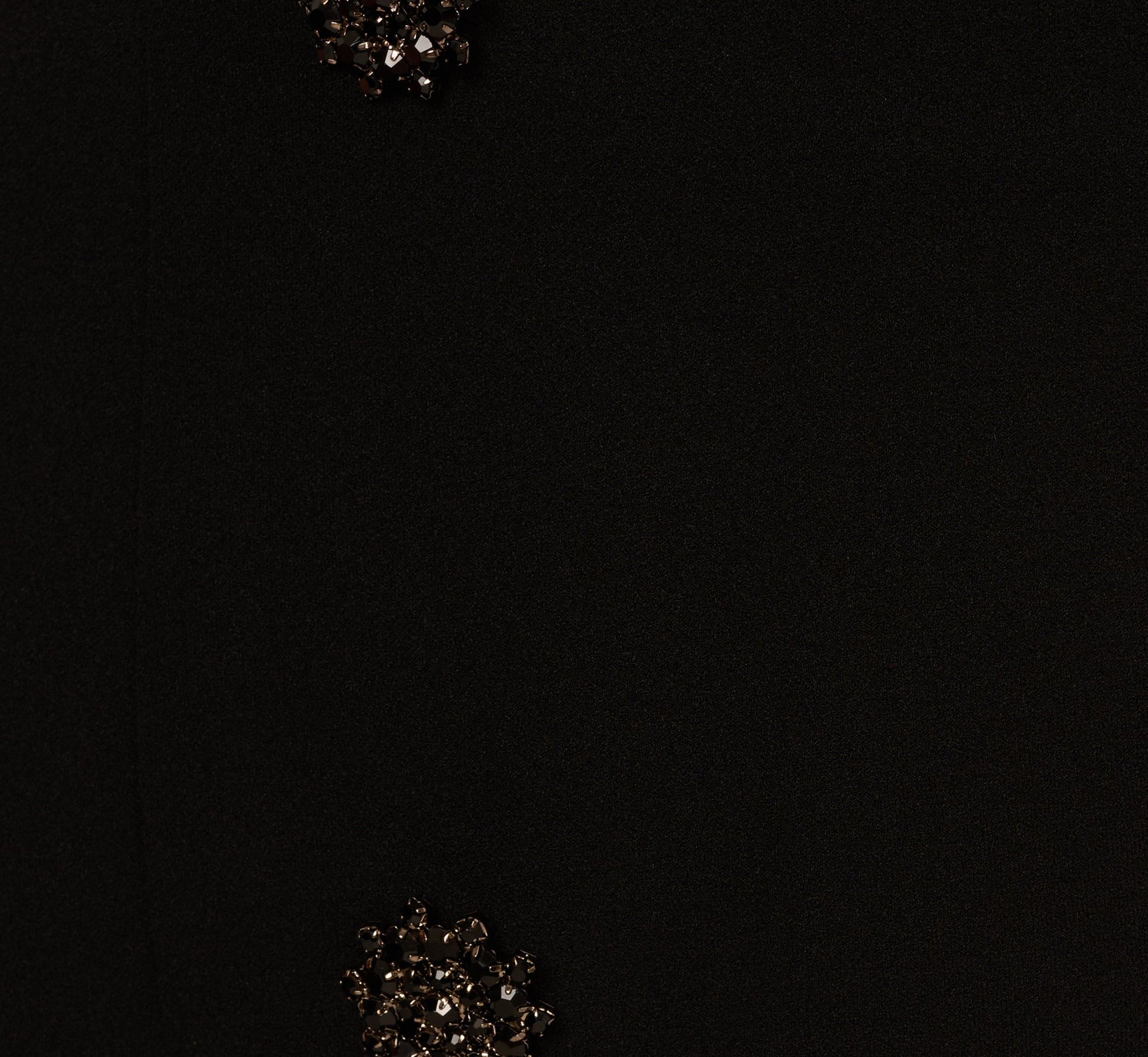 Crafted from structured knit crepe fabric, this black midi blazer-inspired dress features a sleek strapless design and tailored princess seams. The double-breasted front is accented with decorative sparkling buttons, while a back zipper ensures a seamless fit. Finished with stunning satin lapel accents at the neckline, this dress evokes sophistication and glamour.