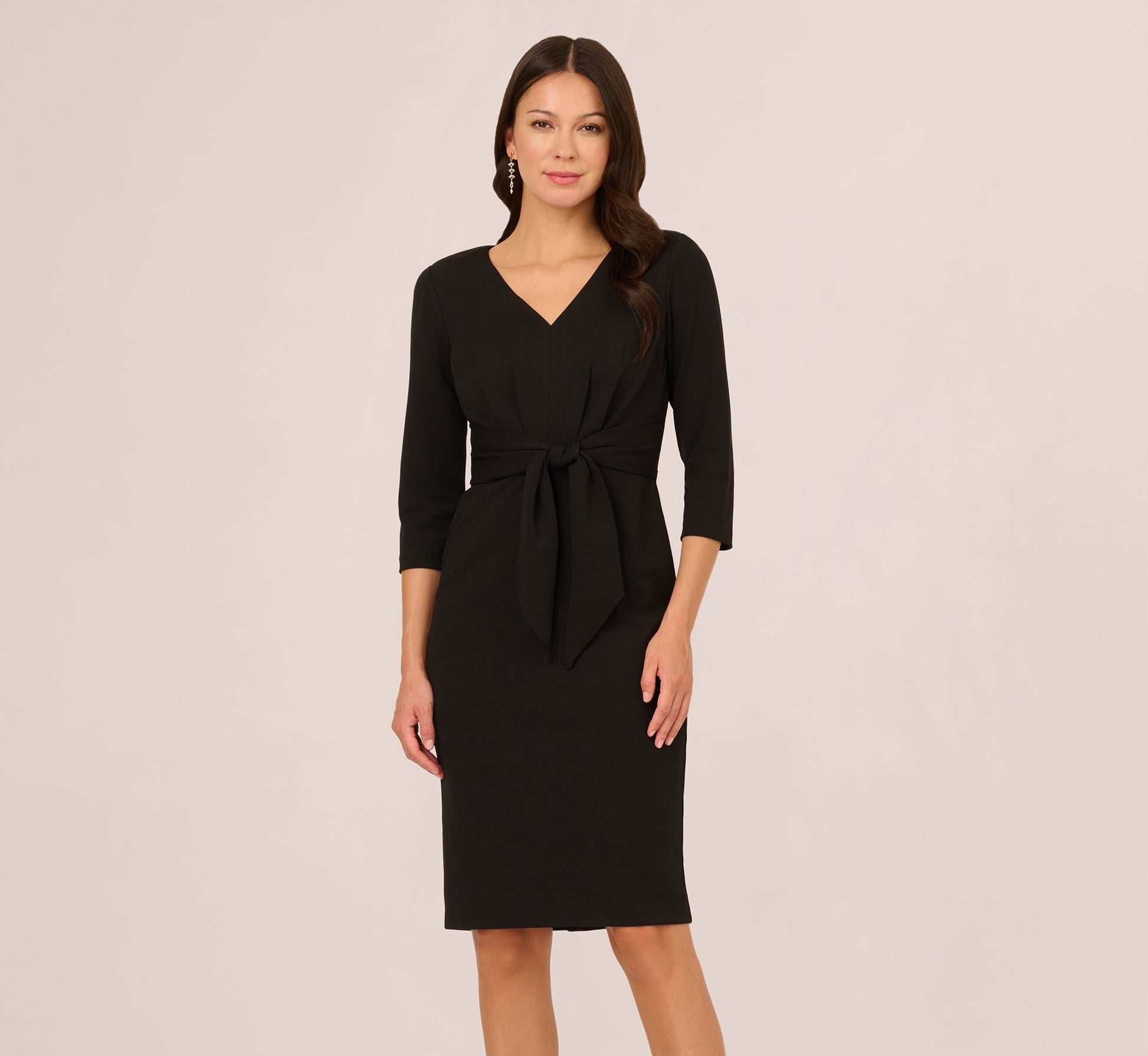 Step into effortless elegance with our knit crepe midi dress, crafted to enhance every silhouette. Featuring a flattering V-neckline and chic three-quarter sleeves, the pleated bodice adds a touch of sophistication while the tie waist cinches perfectly for a tailored fit. The midi skirt flows gracefully, offering both comfort and movement, while a subtle slit at the back adds a hint of allure. Ideal for any occasion, from daytime gatherings to evening affairs, this dress promises versatility and timeless style.