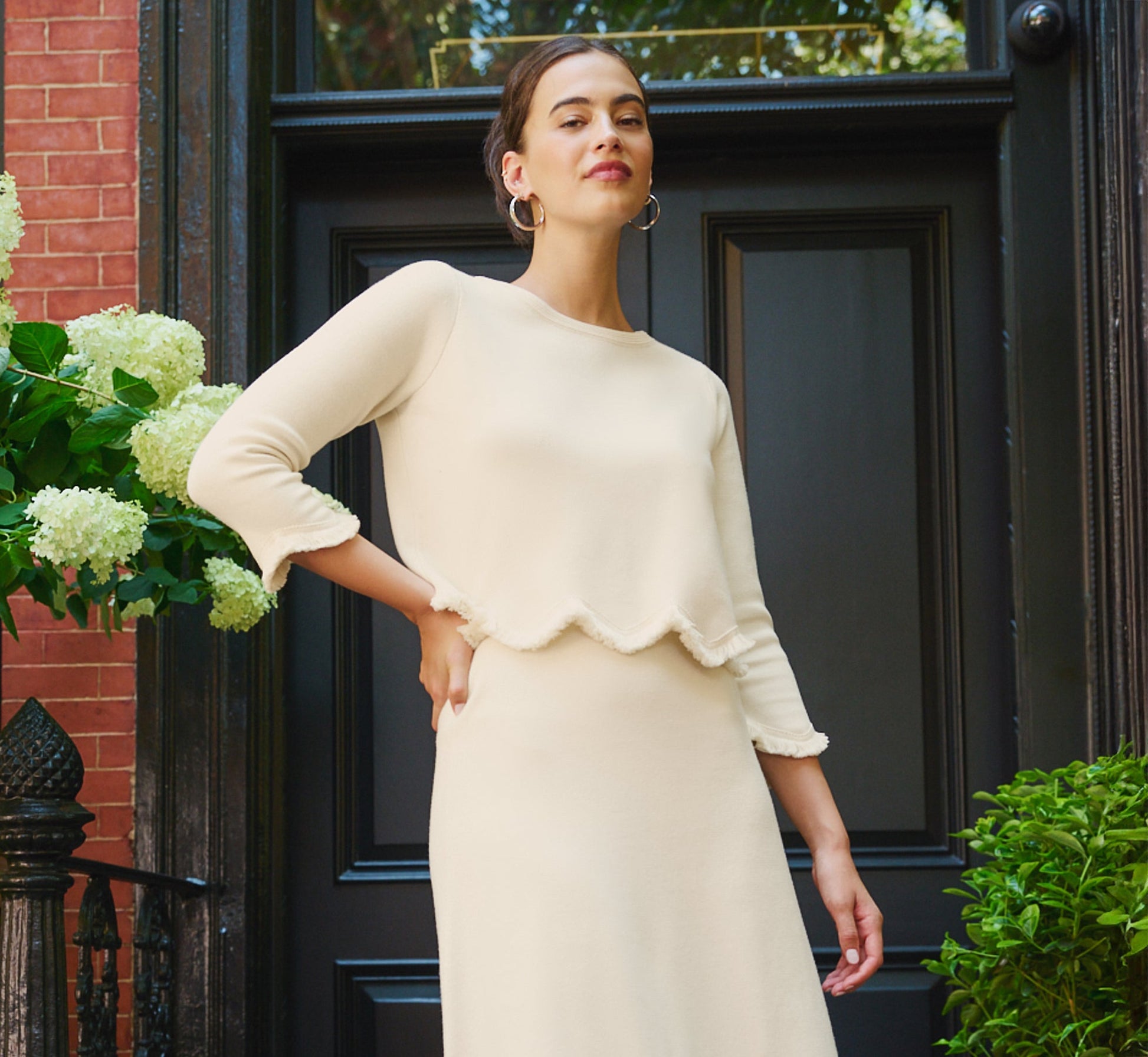 Soft meets sculptural in this cozy pullover sweater, crafted from a plush knit fabric with a gently relaxed fit. Designed with a ribbed boat neck collar and three quarter sleeves, it's finished with scalloped fringe at the cuffs and hem for an elevated touch of texture. An effortless layer for fall brunches, fireside evenings, or holiday gatherings, this sweater will be your new go to for elevating everyday ensembles.