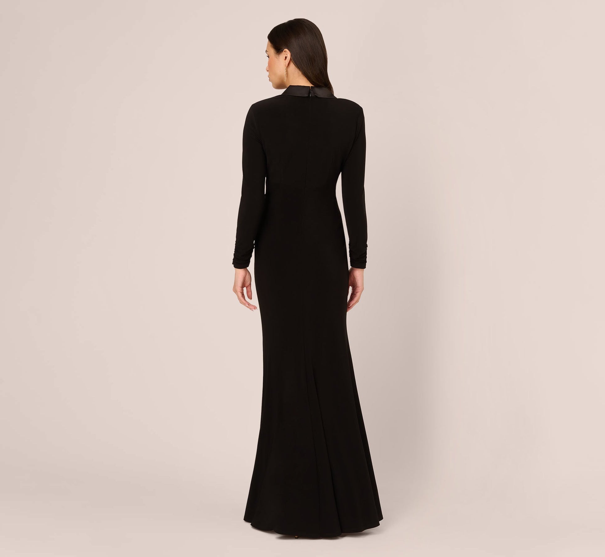 Menswear-inspired details add a tailored look to this evening gown. This formal dress features a faux-wrap bodice flanked by a charmeuse collar, draped details, long sleeves, and a mermaid skirt. Crafted from knit crepe fabric with some stretch for a comfortable fit, this dress has nowaist seam making it easy to wear for any body type. A zipper back closure completes this long sleeve gown. Styled with neutral heels and sparkling earrings, this dress is an elegant choice for a formal occasion or black-tie wedding.
